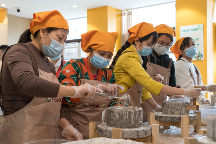 在成都市锦江区喜树路社区,居民在长者食堂学习做豆花(4月26日摄)。新华社记者 唐文豪 摄