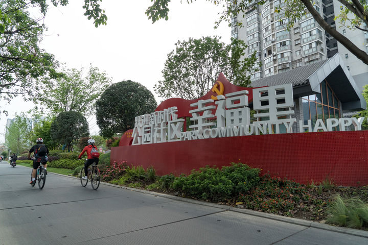 在成都市金牛区,居民在跃进社区党群服务中心外的绿道上骑行(4月26日摄)。新华社记者 唐文豪 摄