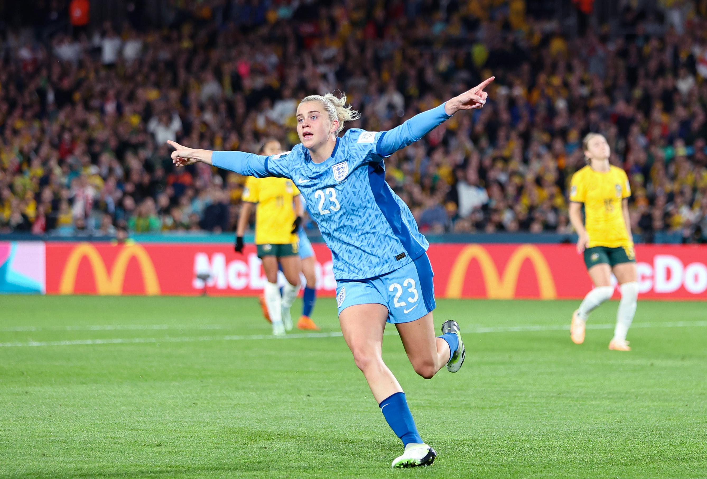 8月16日,英格兰队球员阿莱西娅·拉索在比赛中庆祝进球。当日,英格兰队晋级决赛。新华社记者 白雪飞 摄