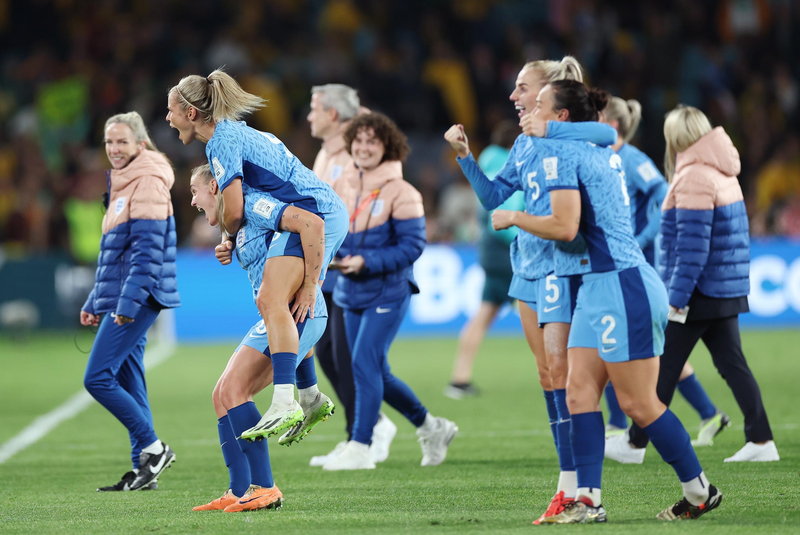 2023年8月16日,英格兰队球员在女足世界杯半决赛后庆祝胜利。新华社记者 白雪飞 摄