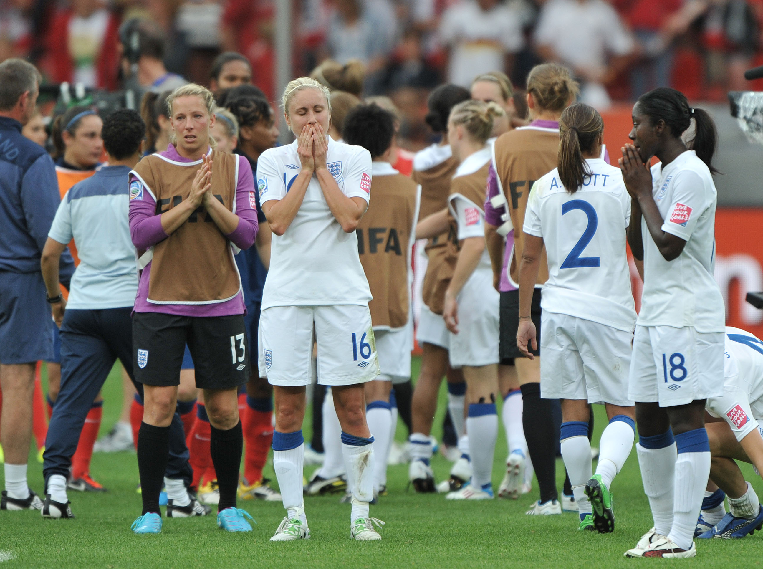 2011年德国女足世界杯四分之一决赛,法国队晋级,英格兰队球员在比赛失利后神情沮丧。新华社记者 武巍 摄