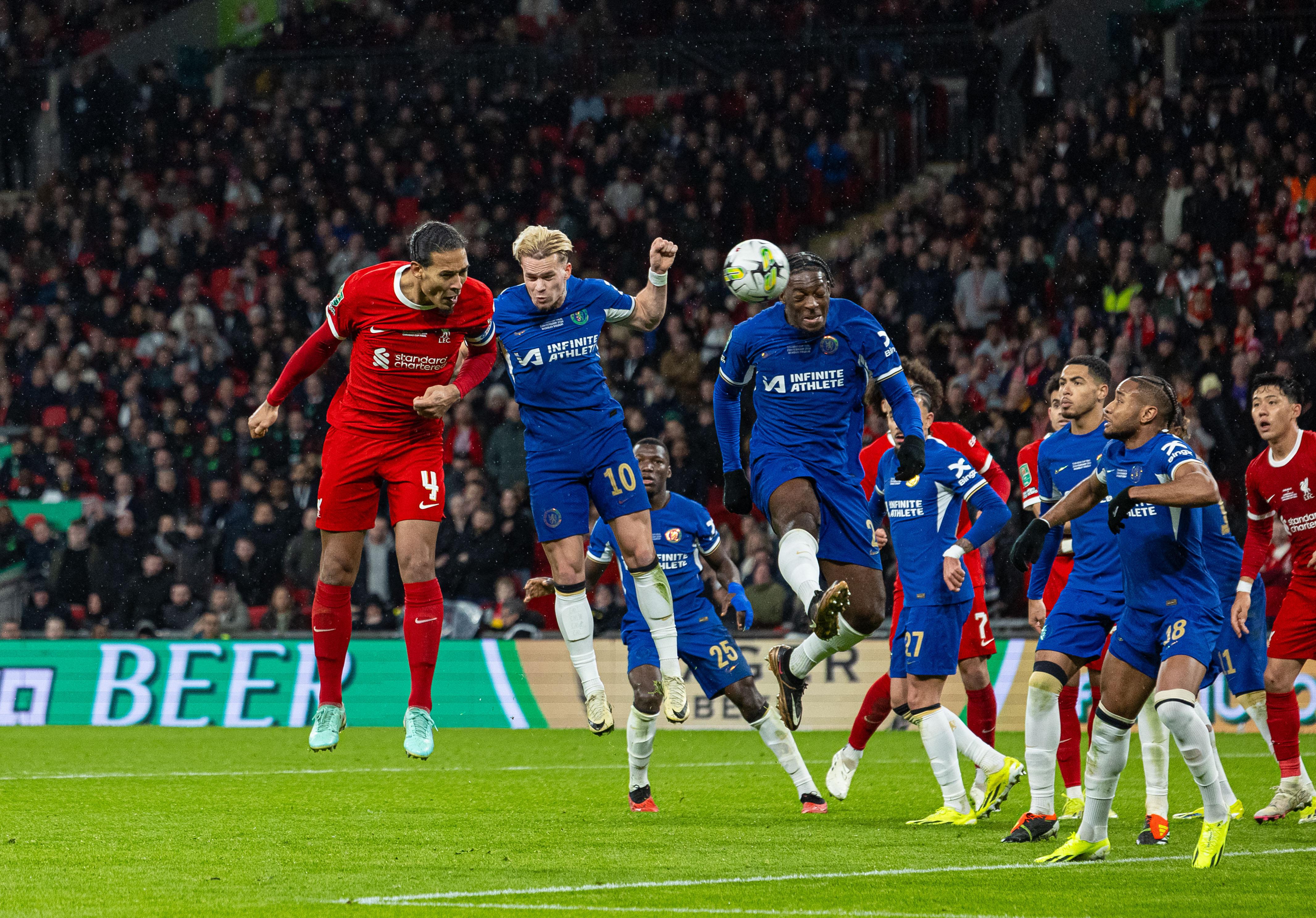 这场在伦敦温布利进行的决赛中,利物浦阵容并不齐整。主将萨拉赫、努涅斯和若塔因伤都没有进入大名单。上半场,切尔西率先获得机会,帕尔默和杰克逊在禁区内连续攻门,但都被化解。第32分钟,斯特林接杰克逊横传禁区内推射破门,但杰克逊被判越位在先,进球无效。直到第40分钟,利物浦终于展现出杀伤力,加克波接罗伯逊的传球头球击中立柱。