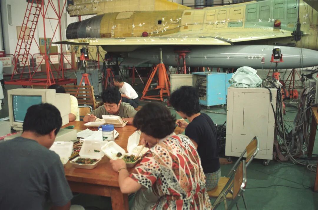 那是1997年的一个夏天,试飞站内闷热如蒸笼,众人为抢进度连续加班,饭食直接送到现场。李勇刚端起饭盒,就瞥见一个背影——一个工作人员穿着一件破洞背心正在打饭。“那件背心已经磨破了,汗渍斑斑,看到那个场景,我感触很深,在90年代艰苦的环境下,一群航空人勒紧裤腰带,一心干好歼-10。”想到这里,李勇立马放下饭盒,对准背影按下快门。
