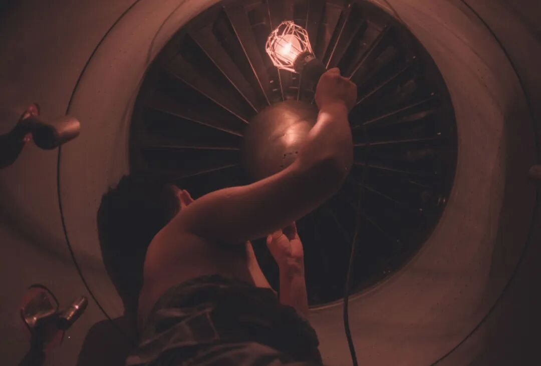 试车台温度还没降,进气道像一条被焊死的隧道。为了保护飞机,同时确保不掉落新的“多余物”,李勇和分队长张波把衣服脱到只剩裤头,两人带着相机艰难地爬进了发动机里,最终到达飞机内受损叶片位置,逐片拍摄。
