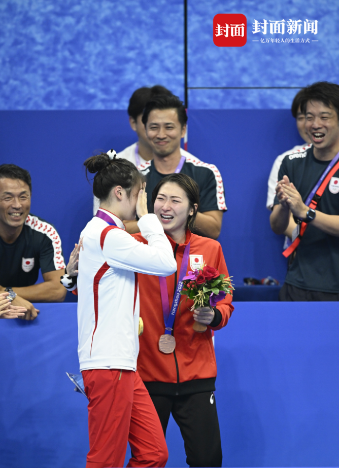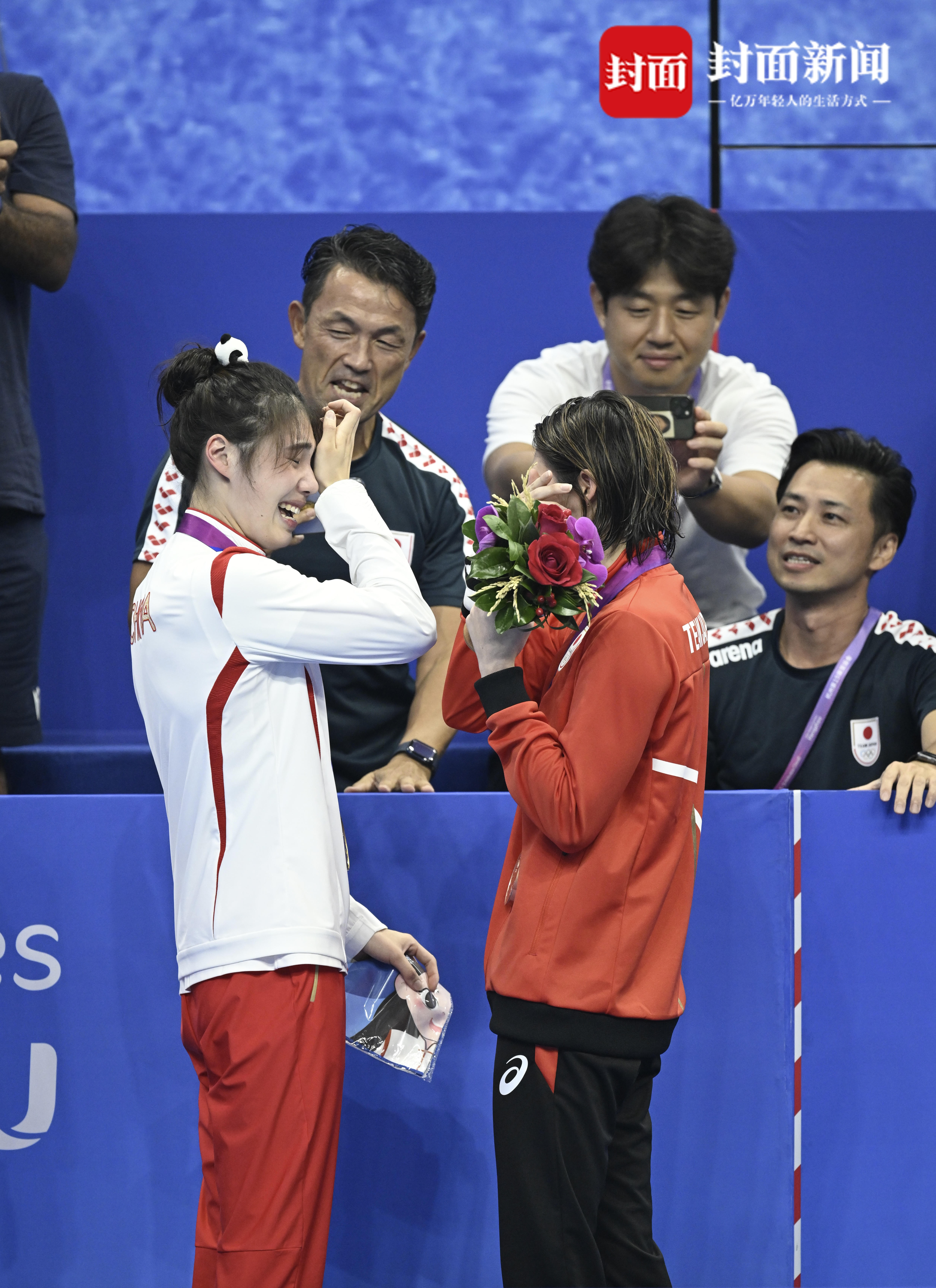 在颁奖仪式后,她和队友余依婷将手中的鲜花扔上看台,感谢现场观众支持。当她准备把手里的另一个小礼物——一张卡通毛巾扔上另一侧看台时,却发现获得铜牌的日本选手池江璃花子正在哭泣,日本队教练和队友正在安慰她。感性的张雨霏也忍不住红了眼眶,眼泪簌簌地往下掉。她一边擦眼泪,一边走过去安慰池江璃花子。池江璃花子转过身来,两人相对而立,眼泪汪汪,池江璃花子又反过来安慰张雨霏。