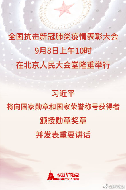 全国抗击新冠肺炎疫情表彰大会8日上午在京举行 @央视新闻 2020-09-07 12:09 36377 全国抗击新冠肺炎疫情表彰大会将于9月8日上午10时在北京人民大会堂隆重举行。中共中央总书记、国家主席、中央军委主席习近平将向国家勋章和国家荣誉称号获得者颁授勋章奖章并发表重要讲话。 评论 0 还没有添加任何评论,快去APP中抢沙发吧! 我要评论