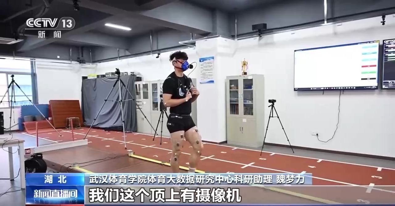 武汉体育学院体育大数据研究中心科研助理 魏梦力:在做一个关于步态能量负荷预测模型算法的研究。他身体关节上贴了很多追踪点,顶上有摄像机会追踪这个点的移位,把他的身体姿态记录下来。我们监测他呼吸的能量消耗,包括肌肉的活动,还有对他身体关节角度的追踪。不同年龄阶段的都要加入进来,样本量比较大。