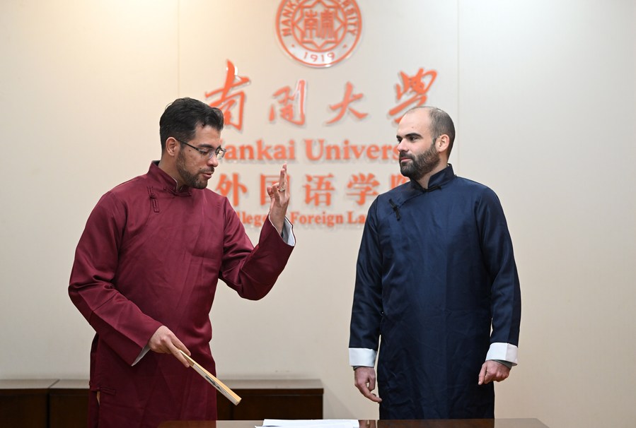 一把折扇、两袭长衫,在南开大学外国语学院的教室里,两位外籍教师用西班牙语说起相声。在富有节奏感的西语捧逗中,中国传统相声大放异彩,引起台下阵阵笑声。