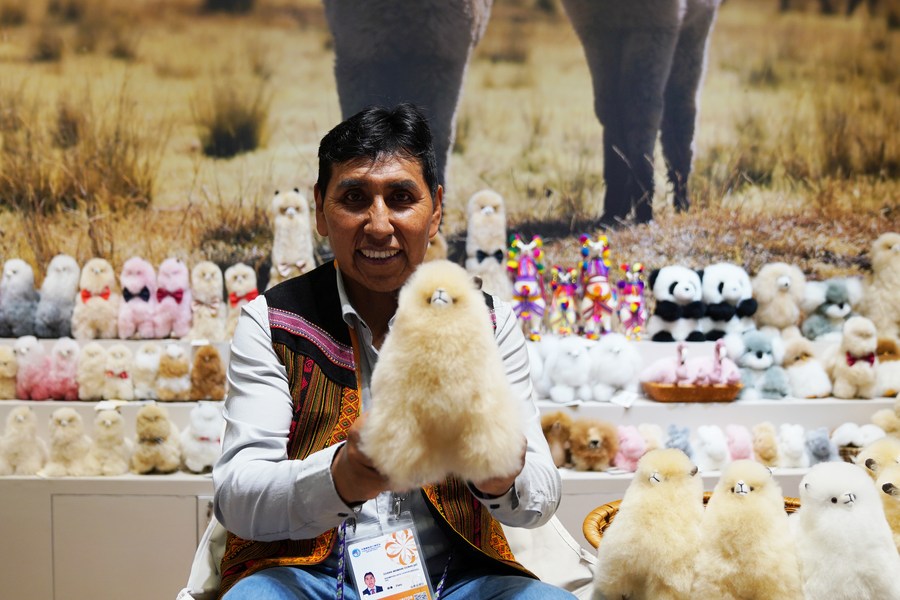 11月,上海,第六届中国国际进口博览会,来自安第斯山区的秘鲁手工艺人奥斯瓦尔多·马马尼身着印第安传统服饰展示着羊驼玩偶制作工艺;