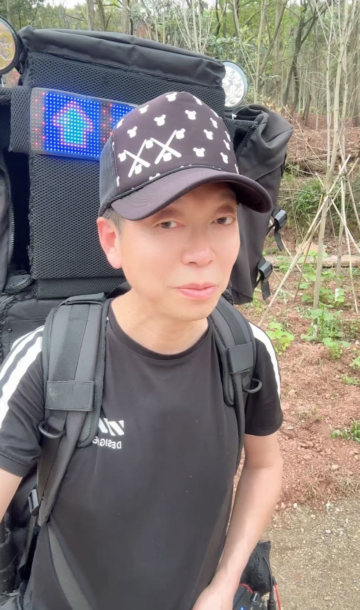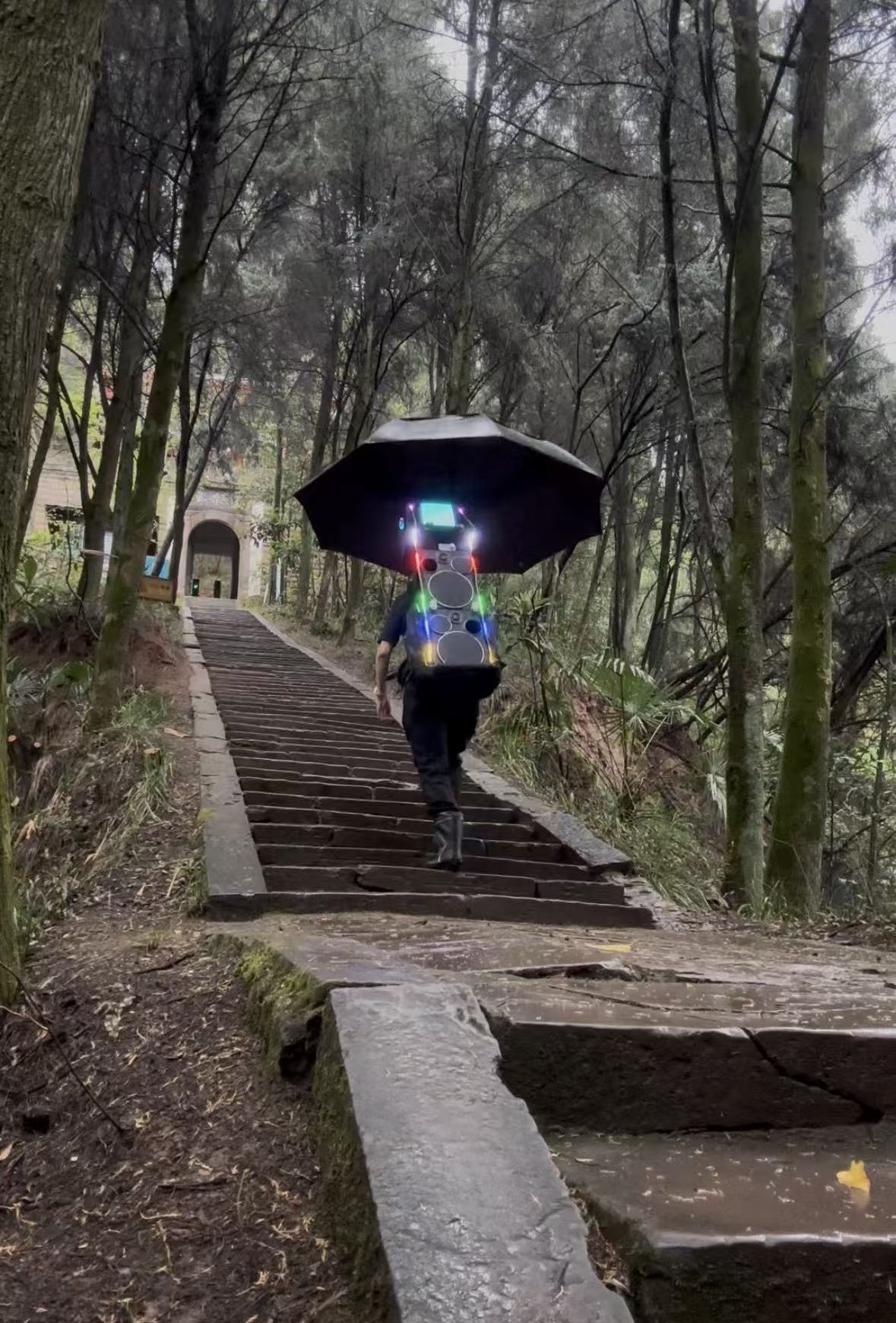 他爬山的方式很硬核,负重。背包从几斤渐增至四五十斤,最重时六十八斤。包里常常装着音响,一路走一路放。“负重才出汗,出汗才健康。冬天跳得再凶也不出汗,背几十斤上去,一走就出汗。”