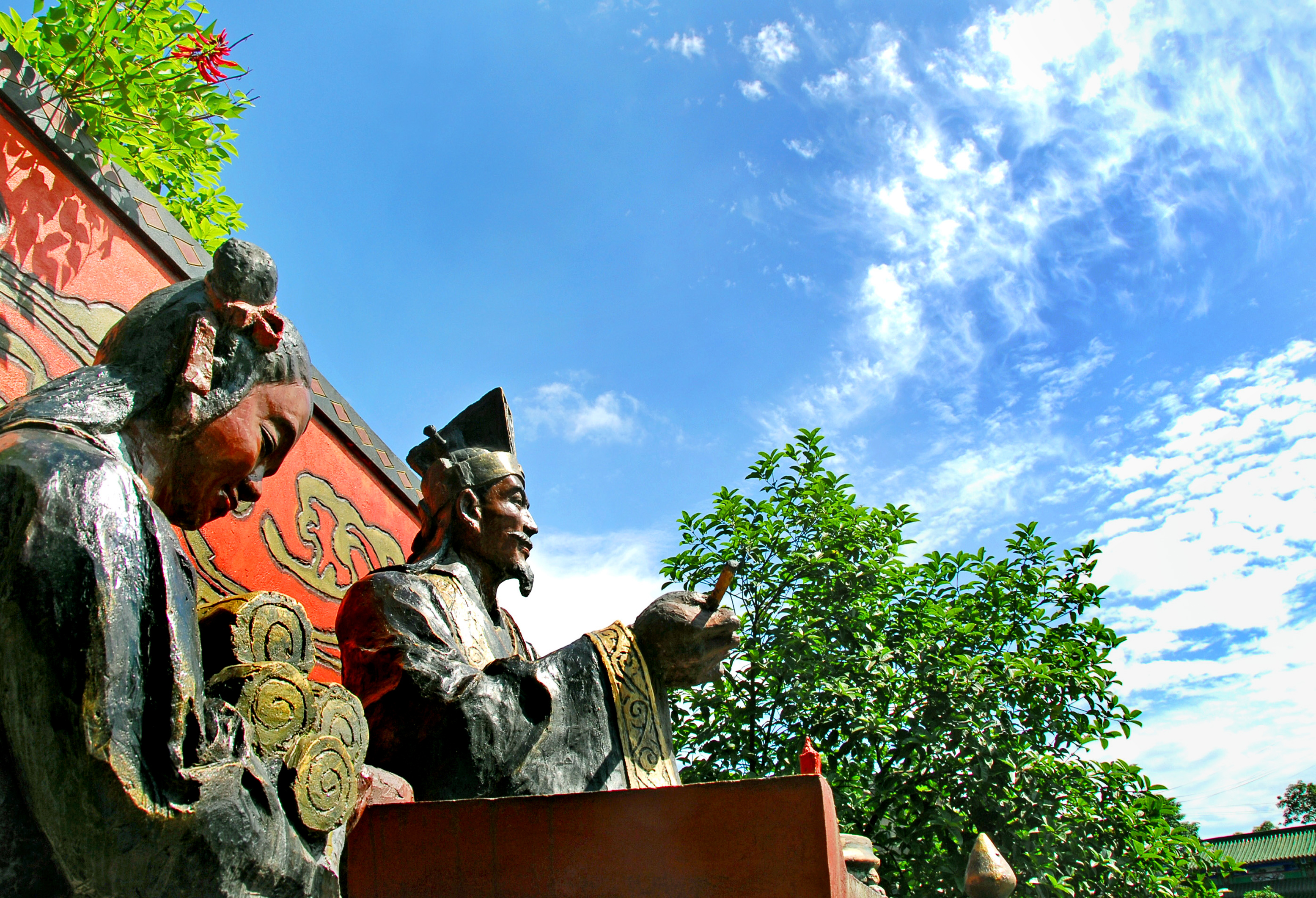 万卷楼踞于玉屏山腰,三重楼阁,朱檐黛瓦,隐隐有汉魏风骨。楼前立着陈寿铜像,手捧书简,面容清瘦,目光低垂。