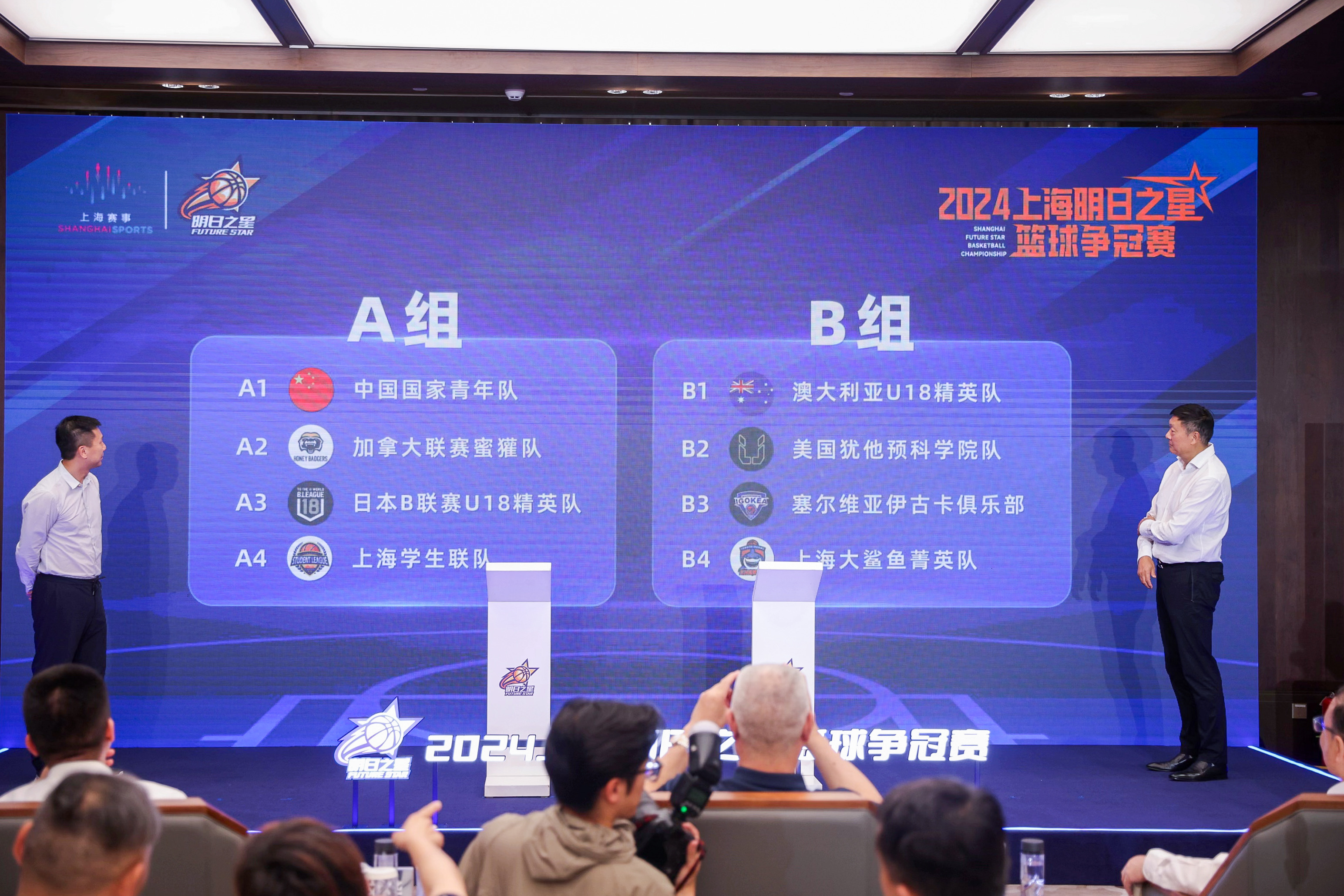 本届赛事共有8支球队参赛,将分为A、B两组,小组赛前两名晋级半决赛,胜者争夺冠军。上海久事体育产业发展(集团)有限公司董事长杨亦斌、上海篮球名宿李秋平在28日的发布会上揭晓本次赛事的分组抽签结果。中国国家青年队与加拿大联赛蜜獾队、日本B联赛U18精英队、上海学生联队同在A组,B组四支球队分别是澳大利亚U18精英队、美国犹他预科学院队、塞尔维亚伊古卡俱乐部、上海大鲨鱼菁英队。