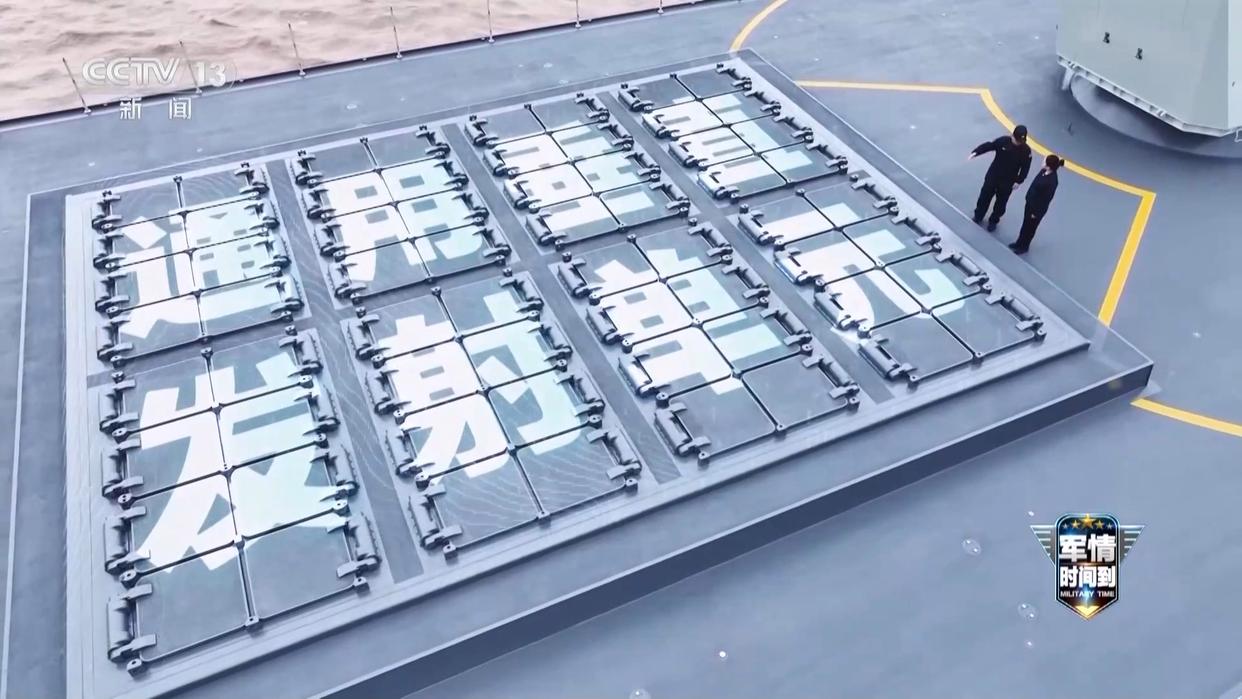 像巧克力块似的,就是垂直发射单元,在前甲板上一共有64块,在舰体中段还有48个,全舰一共是112个发射单元,它主要的特点就是载弹量大,还能装配多种功能的导弹,比如防空、反舰导弹都是从这里发射出去的。
