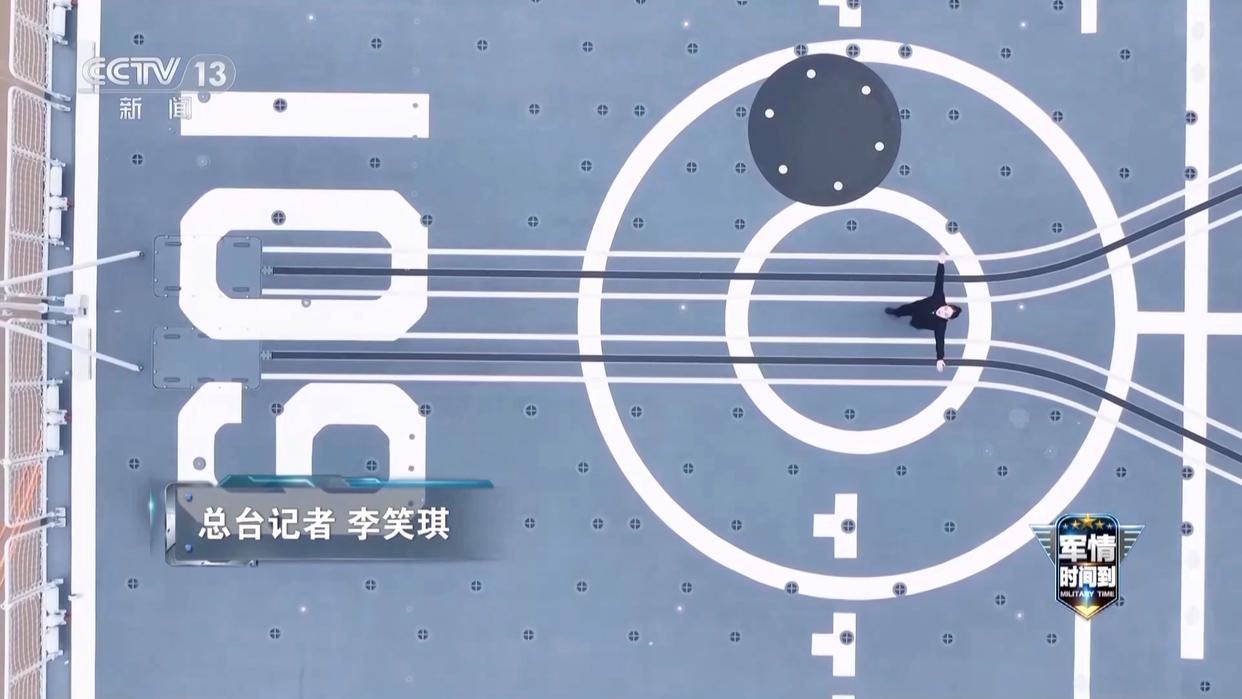 总台记者 李笑琪:接下来我们就要来到飞行甲板的位置,会发现这里很宽阔,那就意味着可以起降更大型的直升机。身后有两个大门,就代表可以同时搭载两架直升机。