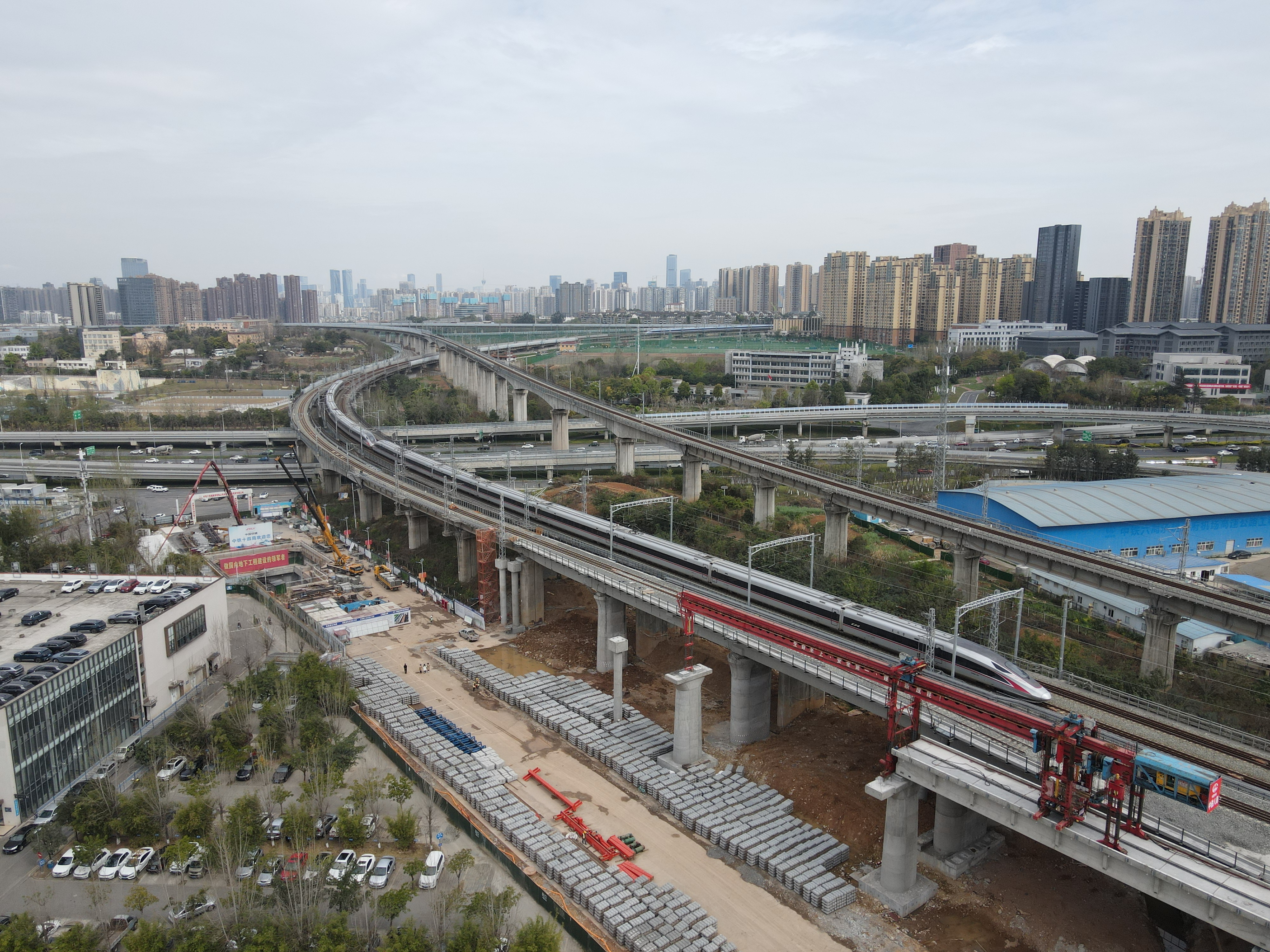 3月25日上午,封面新闻记者提前来到架梁现场探访。施工的具体点位在成都南三环路二段锦逸路附近,紧邻既有线成渝高铁,不时有动车组列车经过。