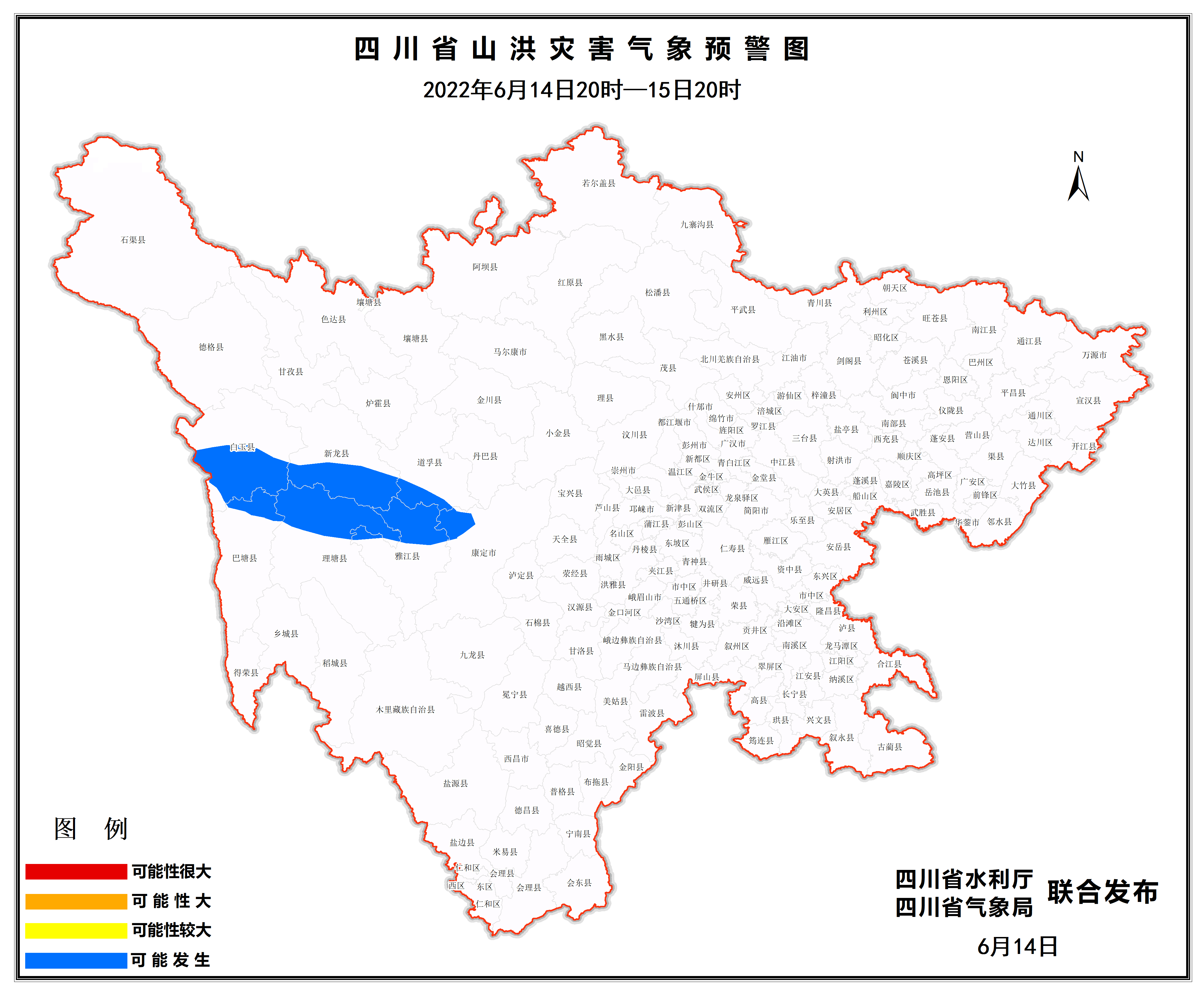 6月14日,四川省水利厅和四川省气象局联合发布山洪灾害蓝色预警。