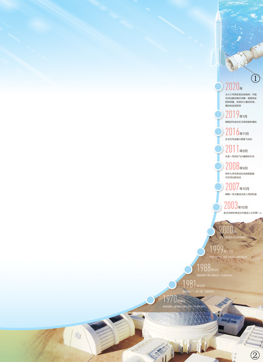从首颗人造卫星到一箭三星,从无人试验飞船到航天员太空出舱,从探测器绕月飞行到月球背面软着陆……中国航天事业正大步迈向国际最前沿。2020年,北斗三号有望实现全球组网、火星探测提上日程,中国人认识和探索太空之旅正积蓄力量,向更高目标挺进。