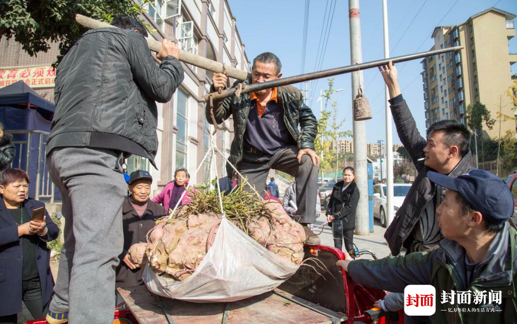 半个月前,周才慧从地里挖出红苕时,光刨开周围的土,就用了半个多小时。红薯全部露出来后,周才慧根本搬不动,用一顿午餐“聘请”了4位好友,5个人才将这个“大家伙”搬上了三轮车。