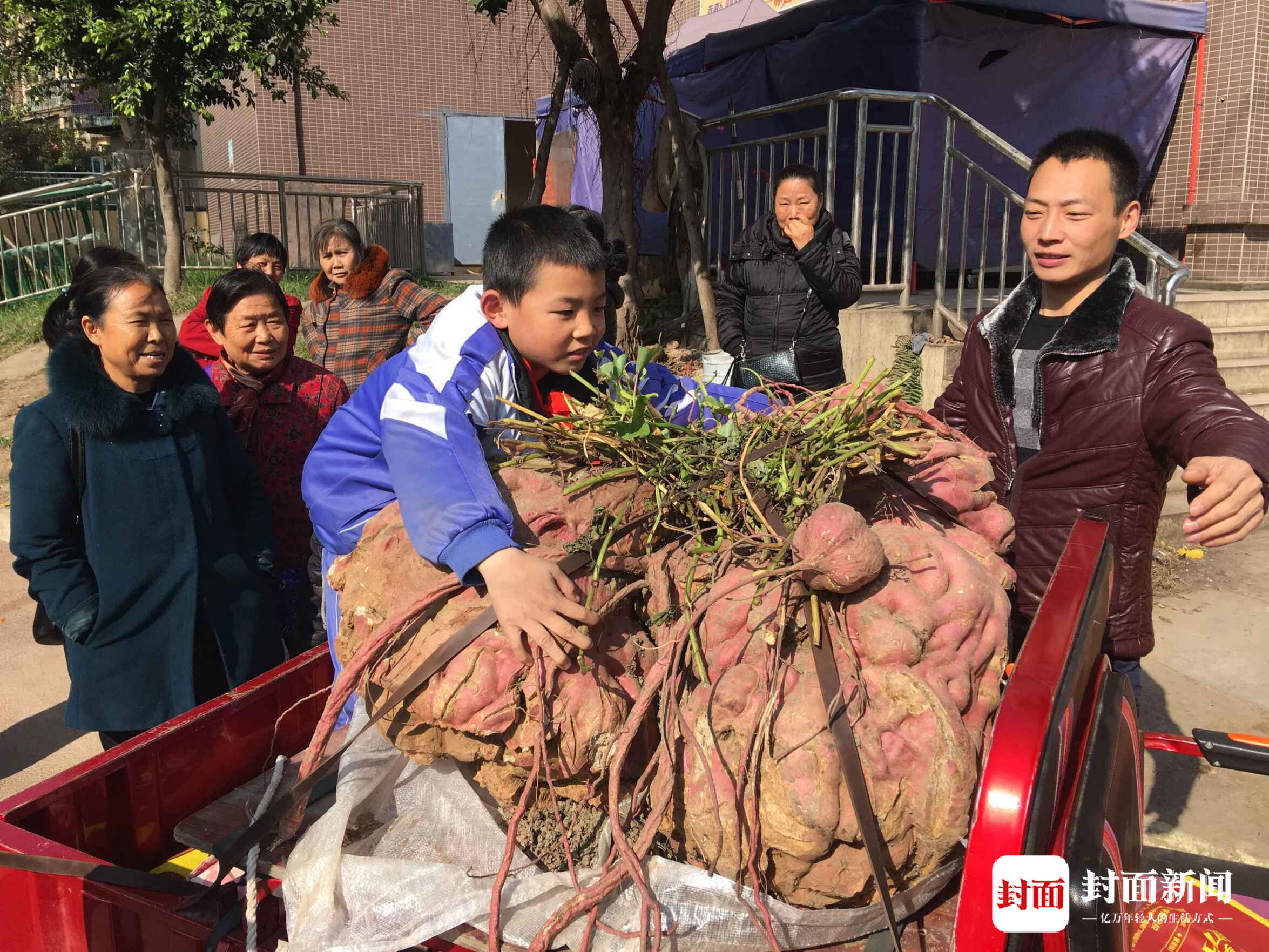 11月30日中午,此次简阳市区民和佳苑小区,61岁的周才慧骑着三轮车刚刚驶出小区,就被人群团团围住。人们都冲着他三轮车上的一颗红薯去的,这颗红薯占据了三车车厢的绝大部分位置,刚挖出时重量达到238斤,被围观的人们呼为“红薯精”。