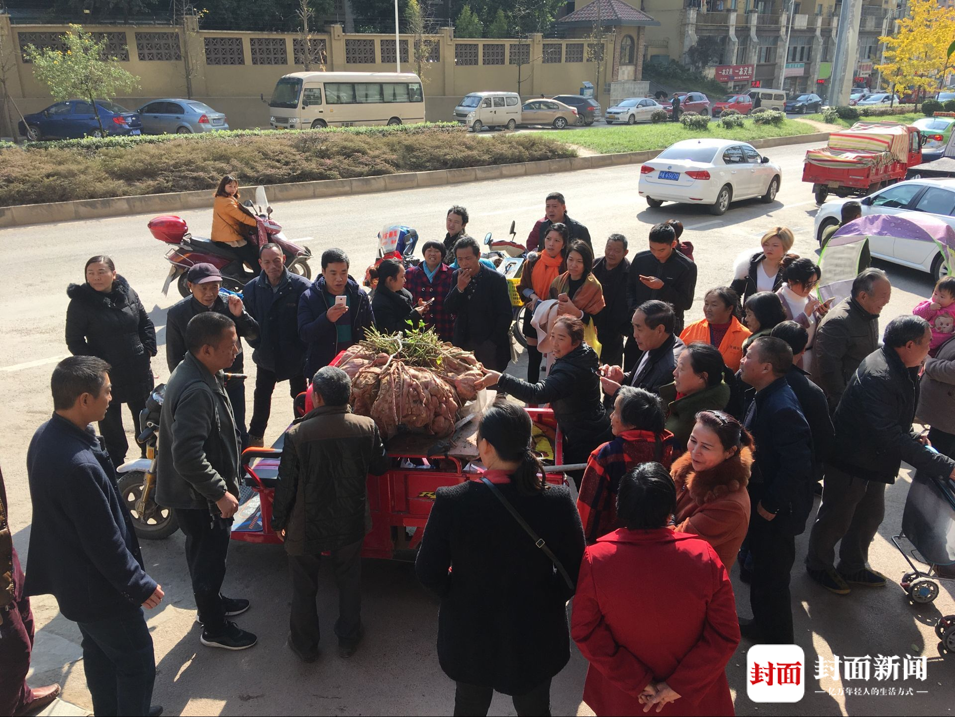 11月30日,民和佳苑小区门口,在围观市民的质疑声中,周才慧要老婆从家里拿来杆秤,现场重新对红薯称重。在两名中年男子的协助下,试了几次,终于将红薯的重量称出来了:218斤!