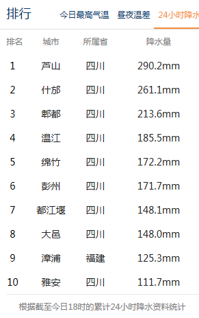 截至8月11日22时的全国降水排行榜上,四川已经包揽了所有前10个席位。
