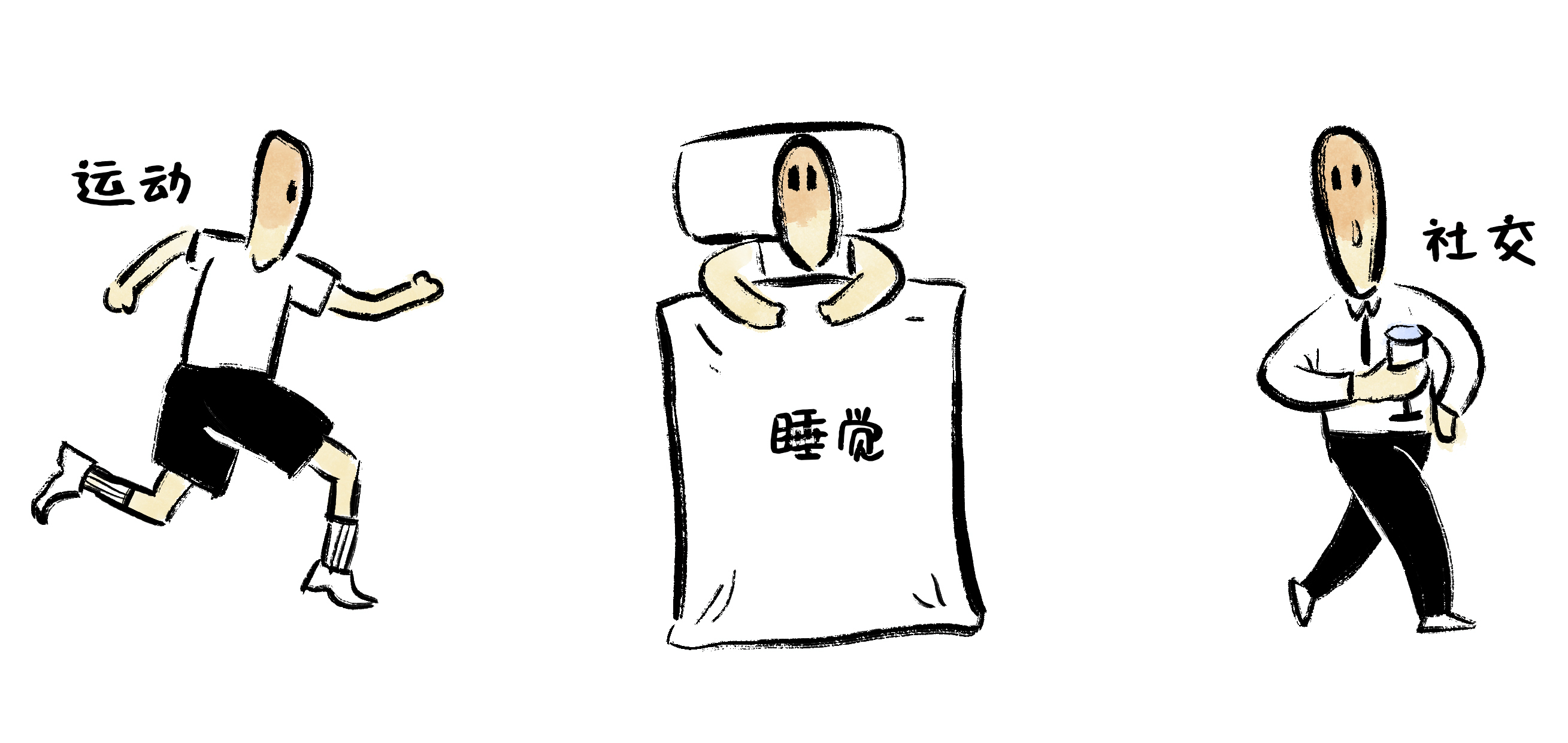 把睡眠、运动、三餐设为“不可妥协项”,优先保障“大脑最低消费”。比如强制自己23点前入睡,并且尽量遵守。吃饭时放下手机,专注进食,凑够20分钟的基础饮食时间。对于运动,如果没有完整的时间块,可以见缝插针、化整为零。比如工作一个小时,起来走一圈,上下班的路上跑步或者骑车到地铁站。