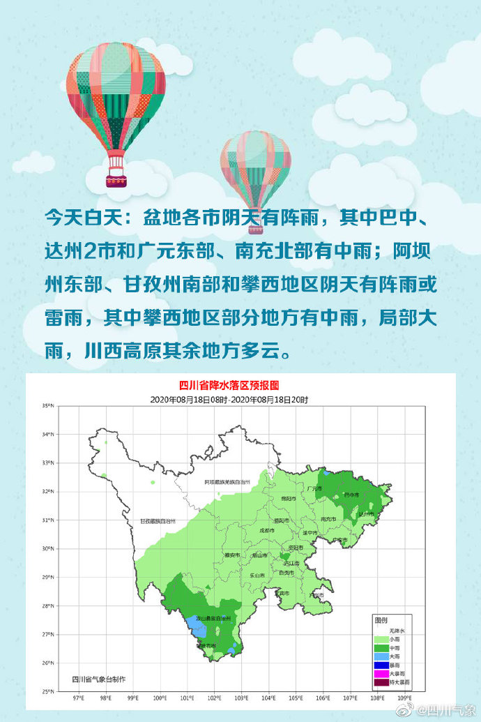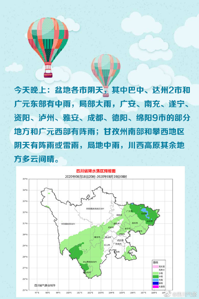 今天白天到晚上:盆地各市阴天有阵雨,其中巴中、达州2市和广元东部、南充北部有中到大雨,局地暴雨……