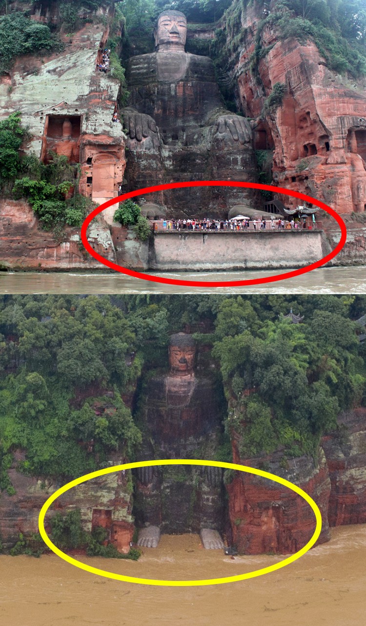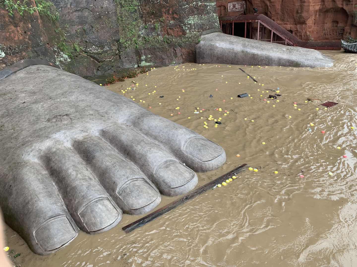 青衣江出现100年一遇洪水,洪水已漫到大佛脚趾。