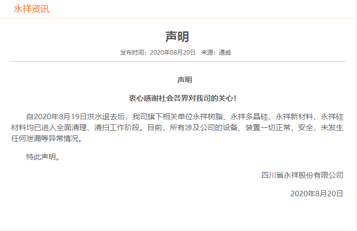 与此同时,四川永祥股份有限公司发布声明:自2020年8月19日洪水退去后,我司旗下相关单位永祥树脂、永祥多晶硅、永祥新材料、永祥硅材料均已进入全面清理、清扫工作阶段。目前,所有涉及公司的设备、装置一切正常、 安全,未发生任何泄漏等异常情况。