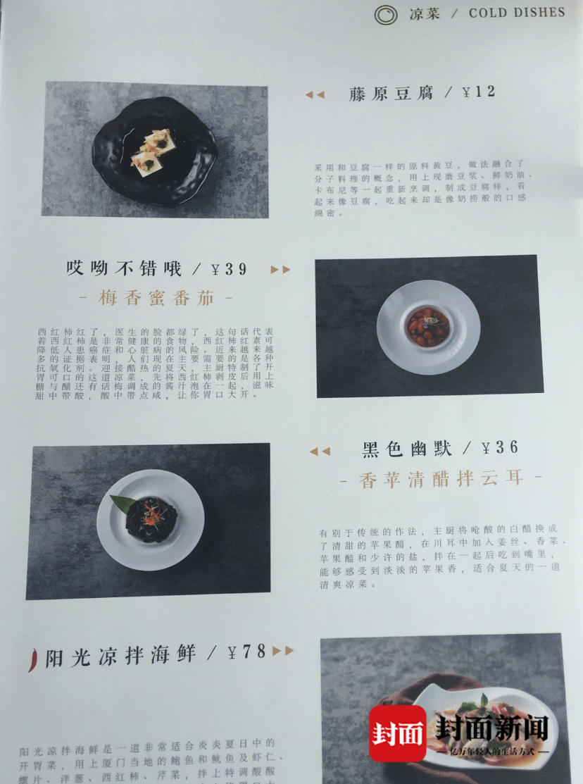 8月20日,记者在某点餐类平台看见,这家叫做J大侠中华料理餐厅的店铺内菜品大多都以周杰伦歌曲命名,在餐厅的凉菜菜单中,几道凉菜分别取名“哎哟不错哟”“黑色幽默”“藤原豆腐”。