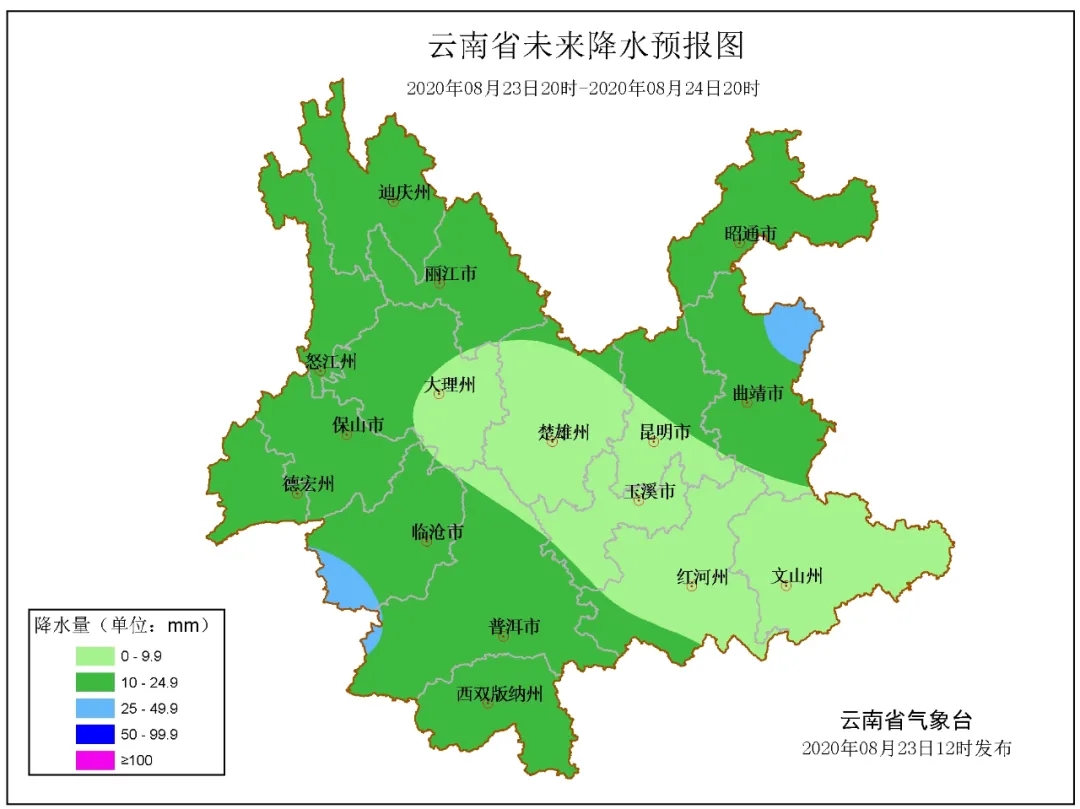 预计8月23日20时—24日20时,昭通、曲靖、昆明北部、丽江、迪庆多云转中雨局部大雨或暴雨,怒江、大理西部、保山、德宏、临沧、普洱、西双版纳、红河西南部阴天间多云有小到中雨局部大雨,其他地区多云有阵雨局部中雨。