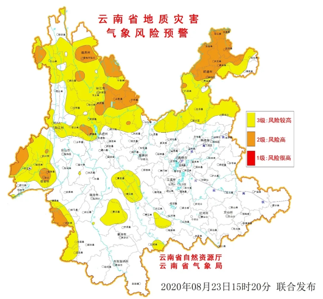 伴随强降雨天气,云南省自然资源厅、云南省气象局8月23日15时20分,联合发布了地质灾害气象风险Ⅱ级预警,预计23日20时—24日20时,昭通、曲靖北部、昆明北部、楚雄北部、丽江、迪庆中南部、大理北部、怒江、保山西部、德宏、临沧西部、普洱东北部和南部、红河南部地质灾害气象风险等级为Ⅲ级(风险较高),其中昭通大部、楚雄西北部、丽江东部、迪庆南部、怒江北部、大理北部、德宏中北部、保山西部、临沧西部地质灾害气象风险等级为Ⅱ级(风险高),易出现滑坡、泥石流和崩塌等地质灾害,需注意防御。