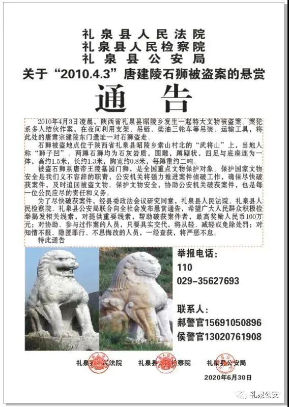 悬赏通告中称,被盗石狮系唐帝王陵墓园门狮,是全国重点文物保护对象。为尽快破案,礼泉县人民法院、礼泉县人民检察院、礼泉县公安局联合向全社会发布悬赏通告,希望广大群众积极检举揭发相关线索,对提供重要线索,帮助破获案件者,最高奖励100万元;对协助,参与过作案的人员,只要具实交代,将从轻,减轻或免除处罚;对知情不报,隐匿罪行,不思悔改的人员,一经查获将严惩。