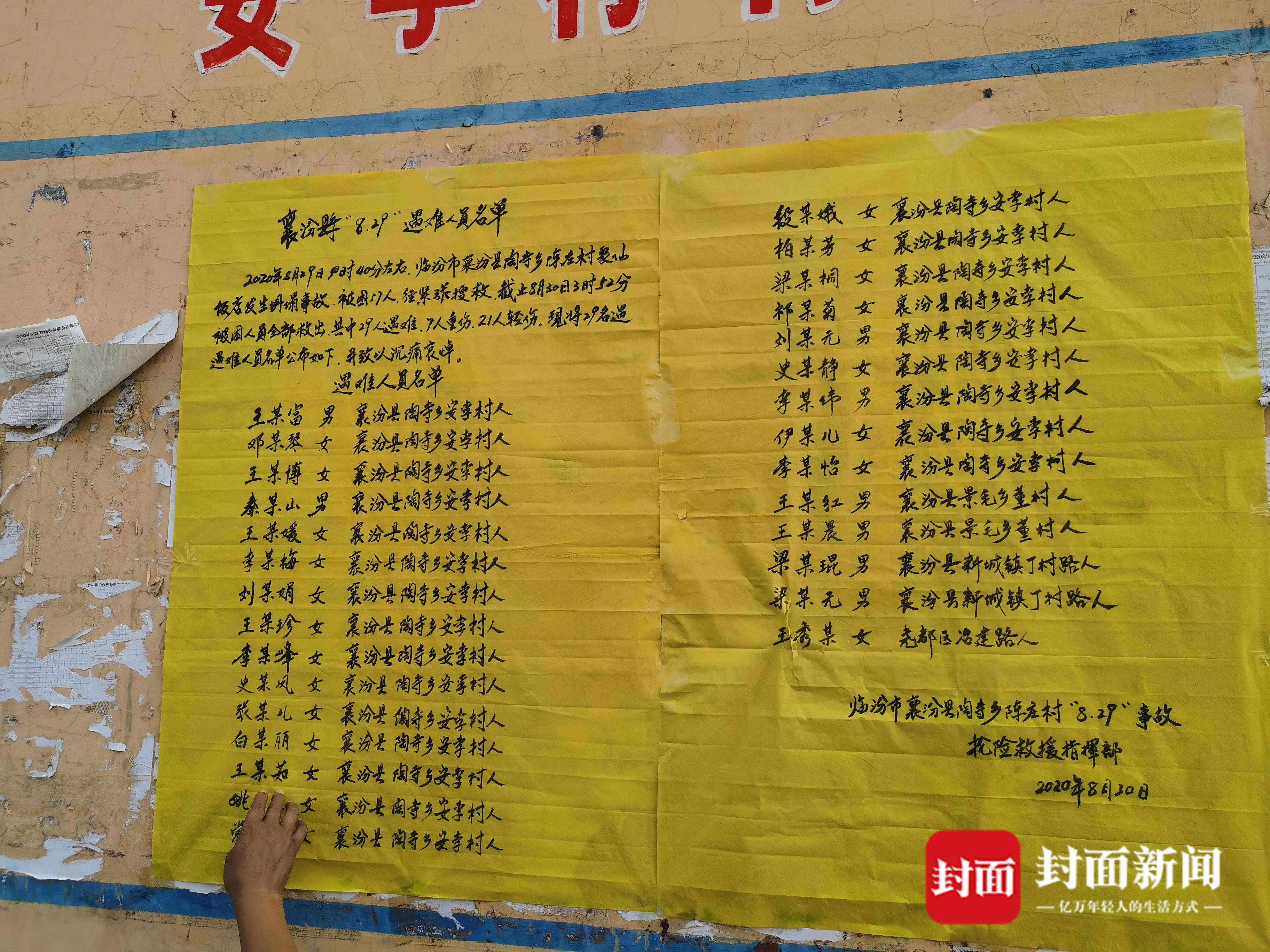 下午4时许,村干部在村务公示墙张贴起“襄汾县8.29”遇难者名单,黄纸黑字,上面写着24名安李村人、2名董村人、3名路人的名字,村干部叹了口气,看着遇难名单数着:上面至少有6个村里的孩子。