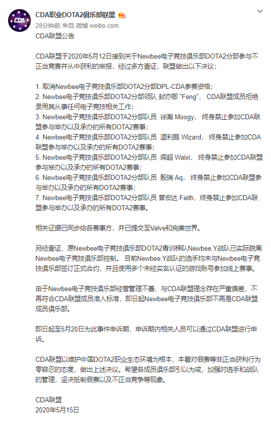 除此之外,电竞行业也存在一些博彩、假赛等破坏公平竞技的行为,如上半年国内DOTA2职业联盟CDA就表示联盟成员Newbee战队存在假赛行为,将其除名禁赛,这支当年TI4的冠军战队因此陨落。