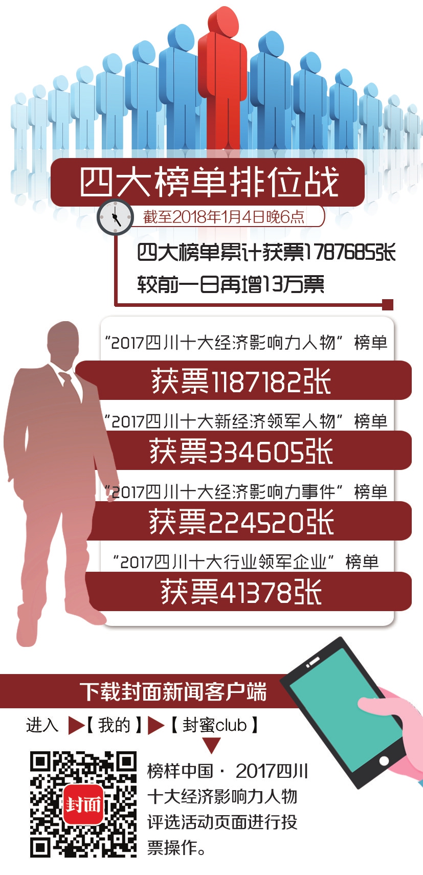 截至2018年1月4日晚6点,通过封面新闻的投票通道,四大榜单累计获票1787685票,较前一日再增13万票。其中,“2017四川十大经济影响力人物”榜单获得1187182票,泸州老窖股份有限公司董事长刘淼、新元素汽车董事长吴亚丽、成都三和企业集团董事长黄宗敏继续蝉联前三甲,刘淼以近10万票居于榜首。在“2017四川十大新经济领军人物”榜单上,四川泽晨唯爱生物科技有限公司董事长宋泽晨以49535票领衔,该榜单累计获票334605张。此外,“2017四川十大经济影响力事件”和“2017四川十大行业领军企业”两大榜单也分别斩获224520票和41378票。