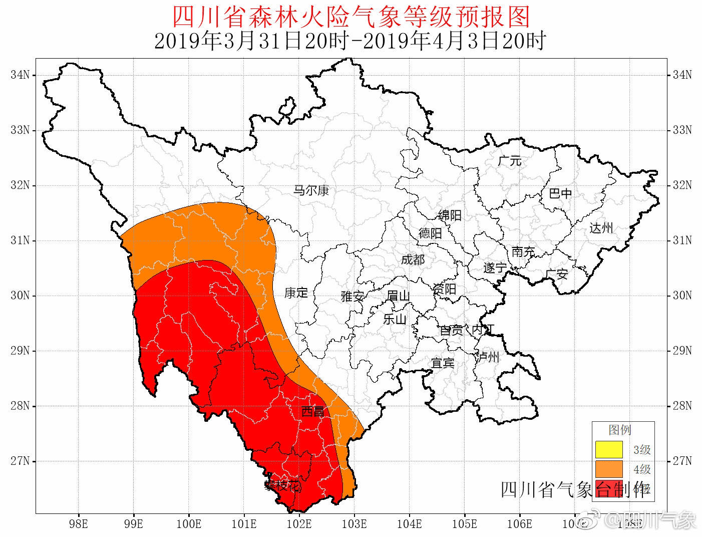 就在3月31日,四川省气象台就发布了森林火险气象等级预报。根据预报,4月1~3日:甘孜州南部和攀西地区以多云到晴天气为主,气温偏高,空气干燥,部分地方森林火险气象等级可达4~5级。
