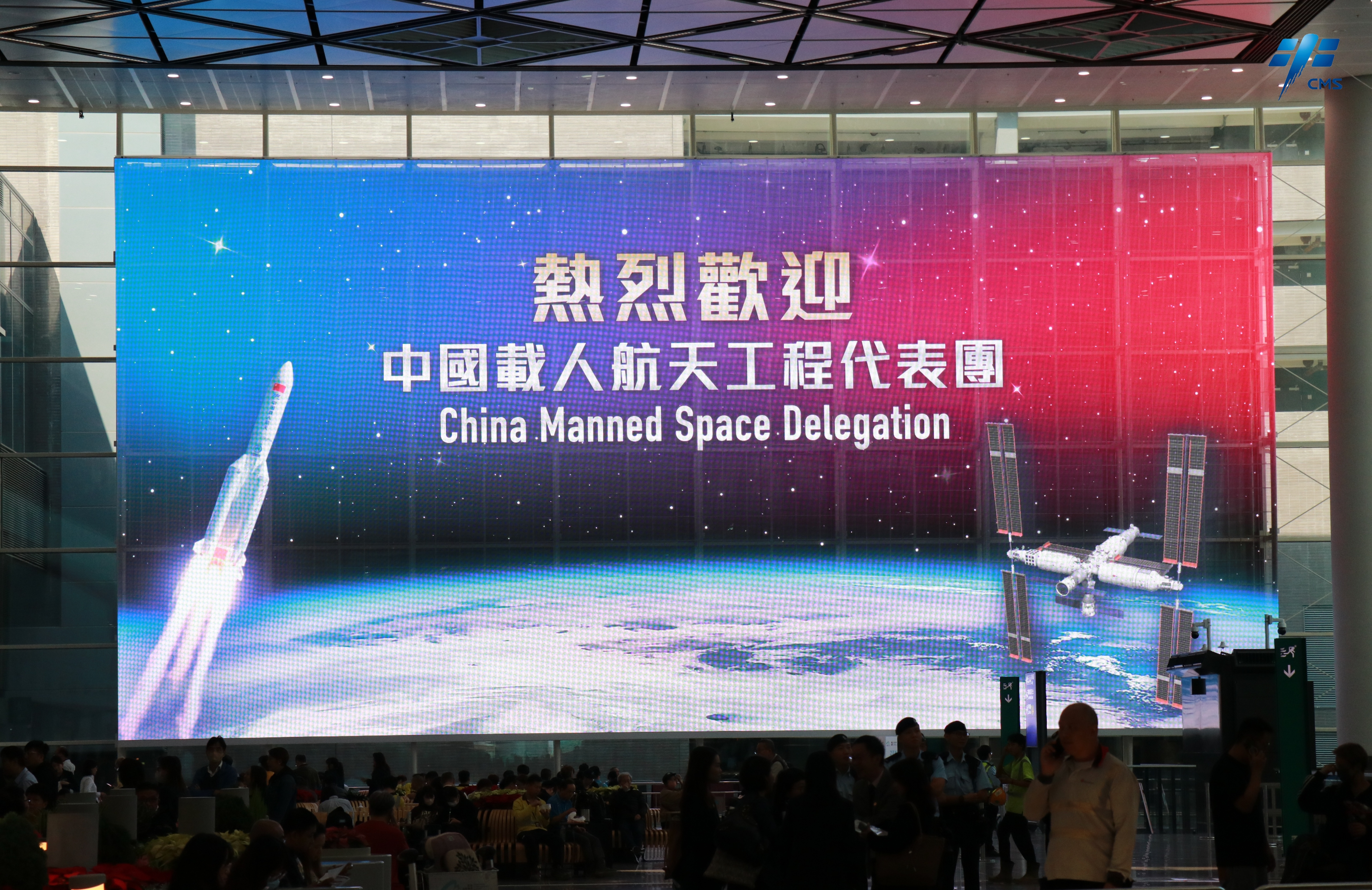 香港特区政府在机场举行了热烈的欢迎仪式。中国载人航天工程办公室副主任、代表团团长林西强,执行空间站建造任务的神舟十二号乘组、神舟十三号乘组、神舟十四号乘组、神舟十五号乘组航天员代表刘伯明、王亚平、陈冬、张陆率先步出机场大厅。香港特区政府政务司司长陈国基、民政及青年事务局局长麦美娟等政府官员到机场迎接。百余名香港小学生们在现场挥舞着五星红旗和紫荆花区旗,热情欢迎代表团的到来。