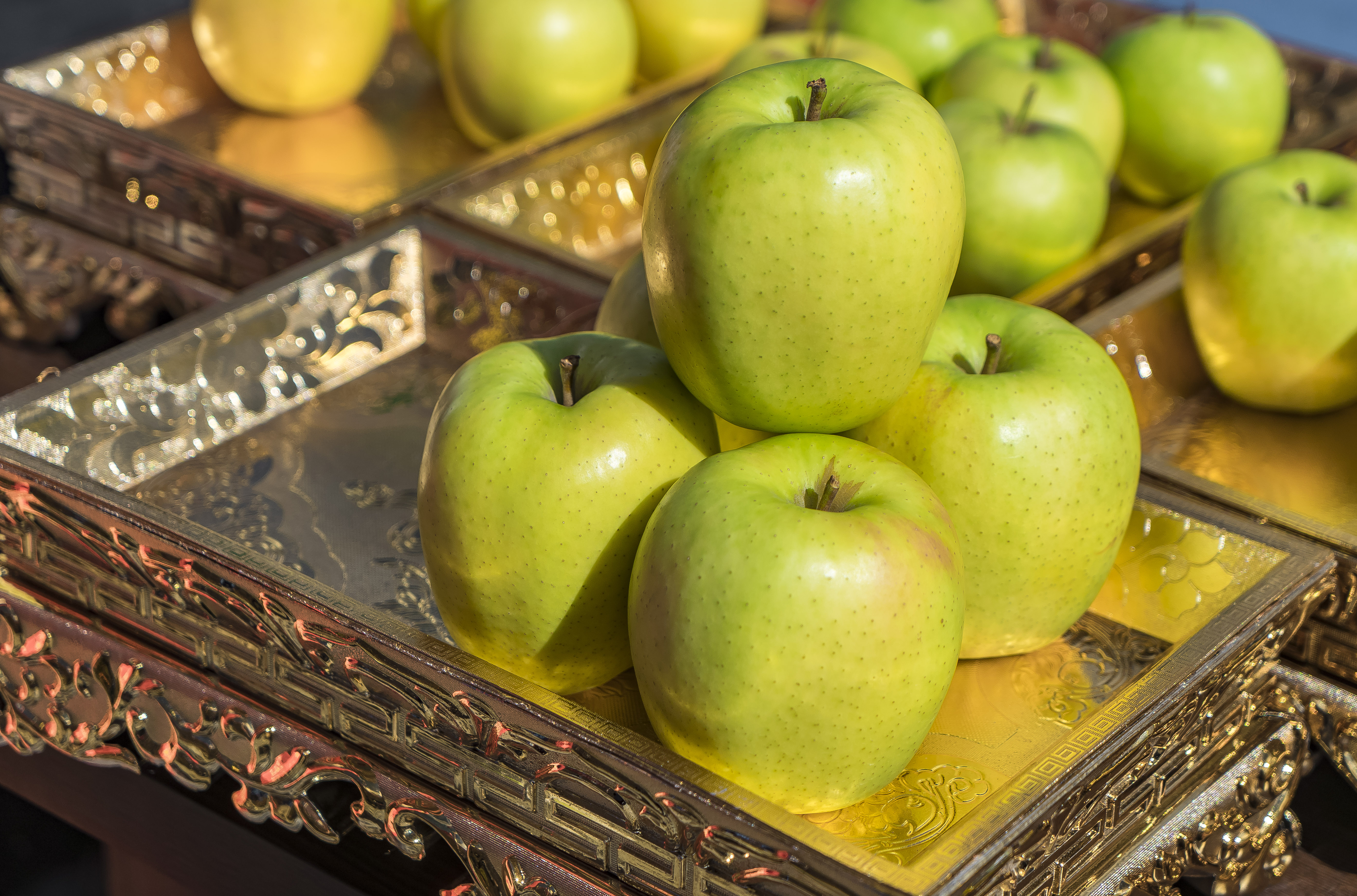 苹果节现场,一筐筐刚采摘下来的苹果精心摆放在舞台两旁,上面放着“庆丰收”字样的图案,来自当地的老百姓和全国各地的游客早早地相聚在一起,等待这场丰收的庆典。