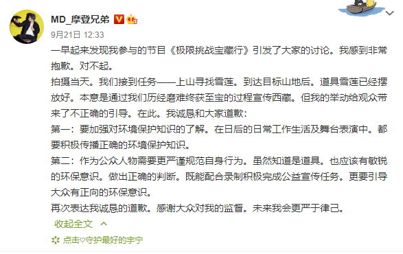 事后,作为节目嘉宾之一的刘宇宁在微博上道歉。他表示,节目中的雪莲是提前摆好的道具,如此设计的本意是“通过我们历经磨难终获至宝的过程宣传西藏”,但自己的举动给观众确实带来了不正确的引导。