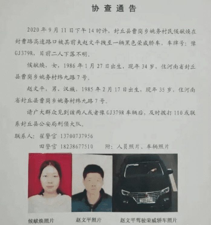 9月11日,河南新乡封丘县曹岗乡姚务村一女子侯某焕在高速路口,被前夫赵某平拽上车之后已经失联12天,车牌号豫GJ379R,两人目前下落不明。
