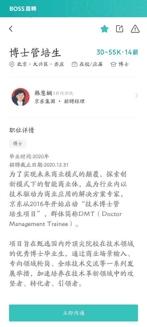 “管培生”,是一些大企业自主培养中高层管理人员或技术人员的人才储备计划,并非新鲜词汇。然而,将学历门槛提至博士层面的管培生岗,在当下的求职市场中较为罕见。