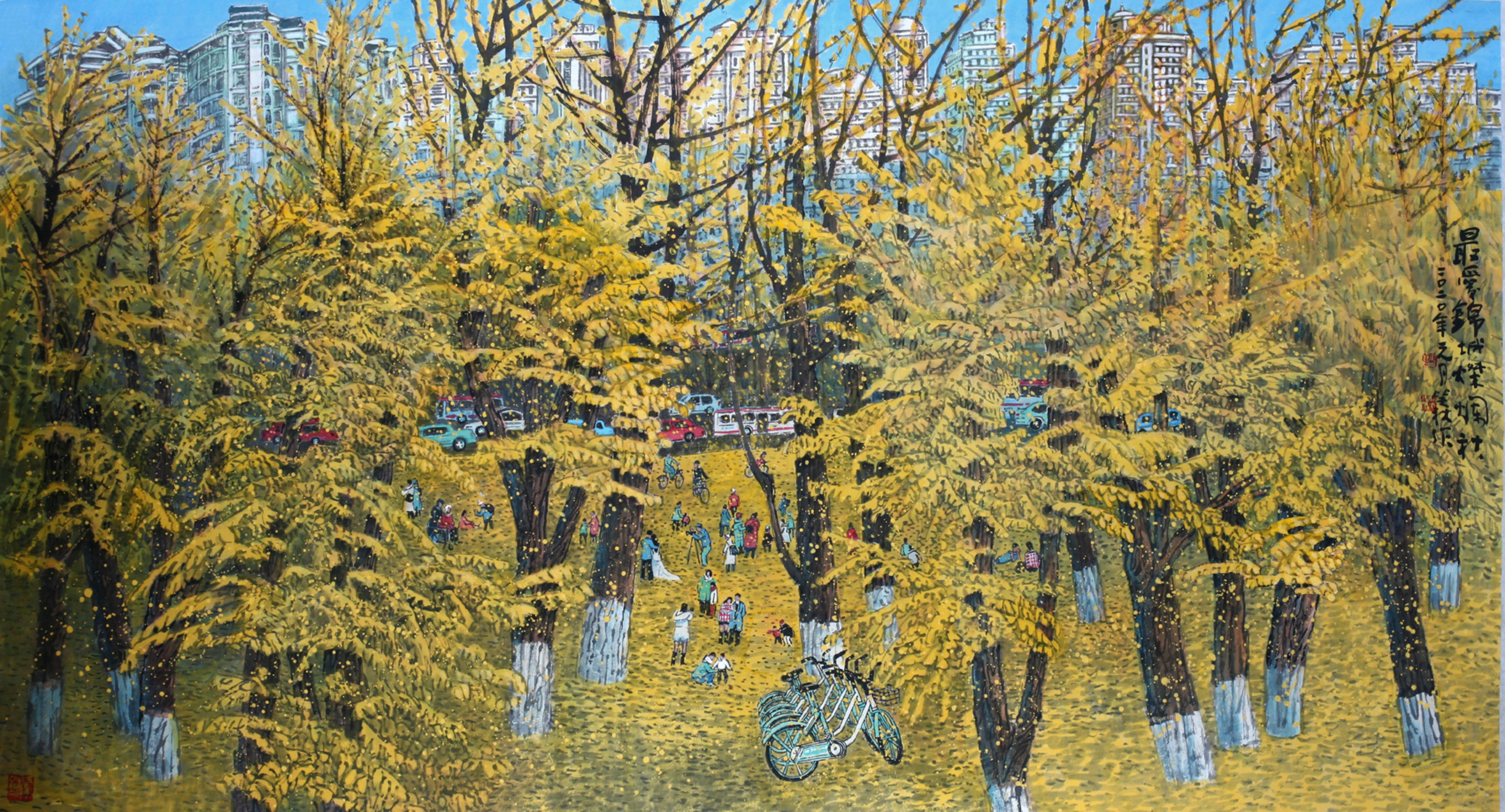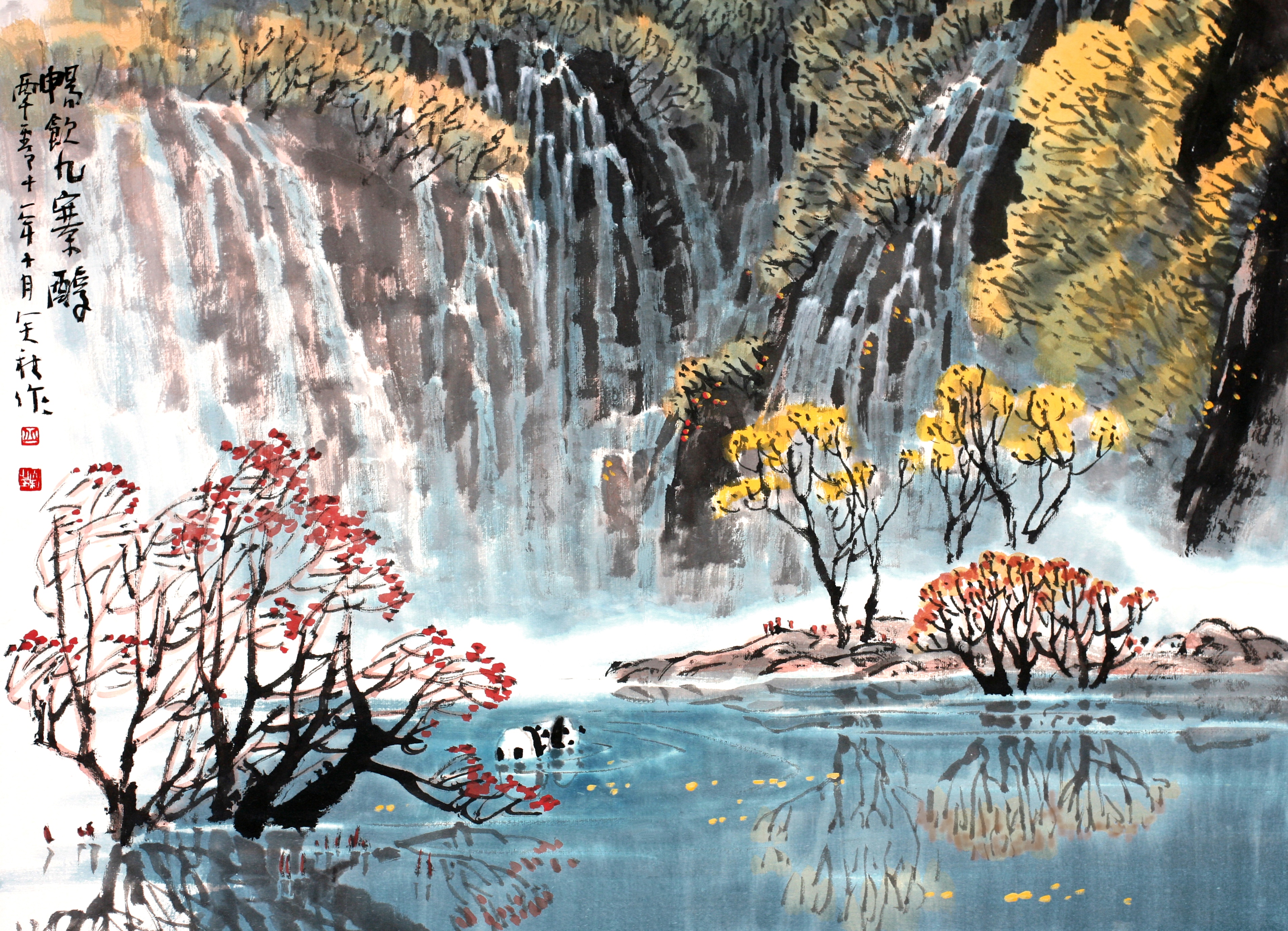 这幅创作中的作品也是在描绘秋景,取材于九寨沟落日朗瀑布一带的景致。大气磅礴、风度雄浑。他已经用四天时间用墨线勾勒好了整体框架,还将用去七天去上色和打磨,待到整体完工需要半个月的仔细雕琢。