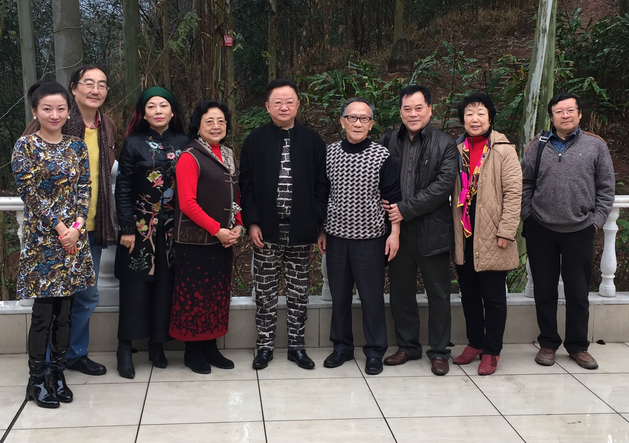 2016年,邱笑秋与爱妻曾先芬女士(左四),同林木、牟群等四川美术学院的美术评论家合影留念