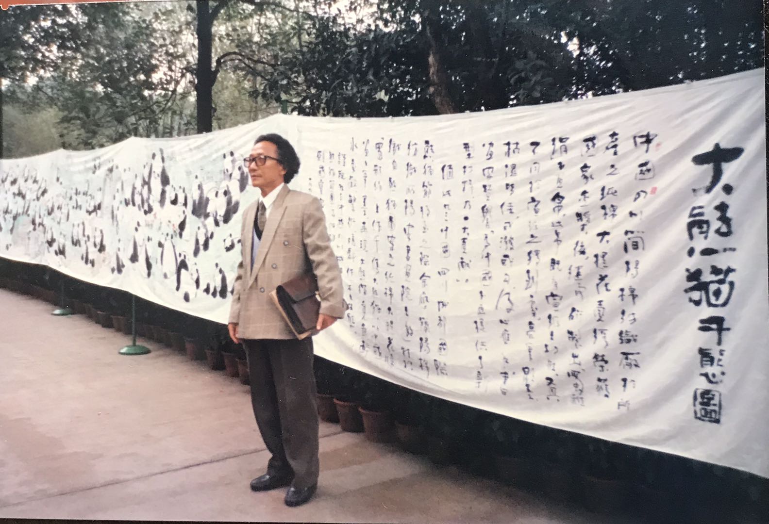 邱笑秋与正在展出的88米《大熊猫千态图》