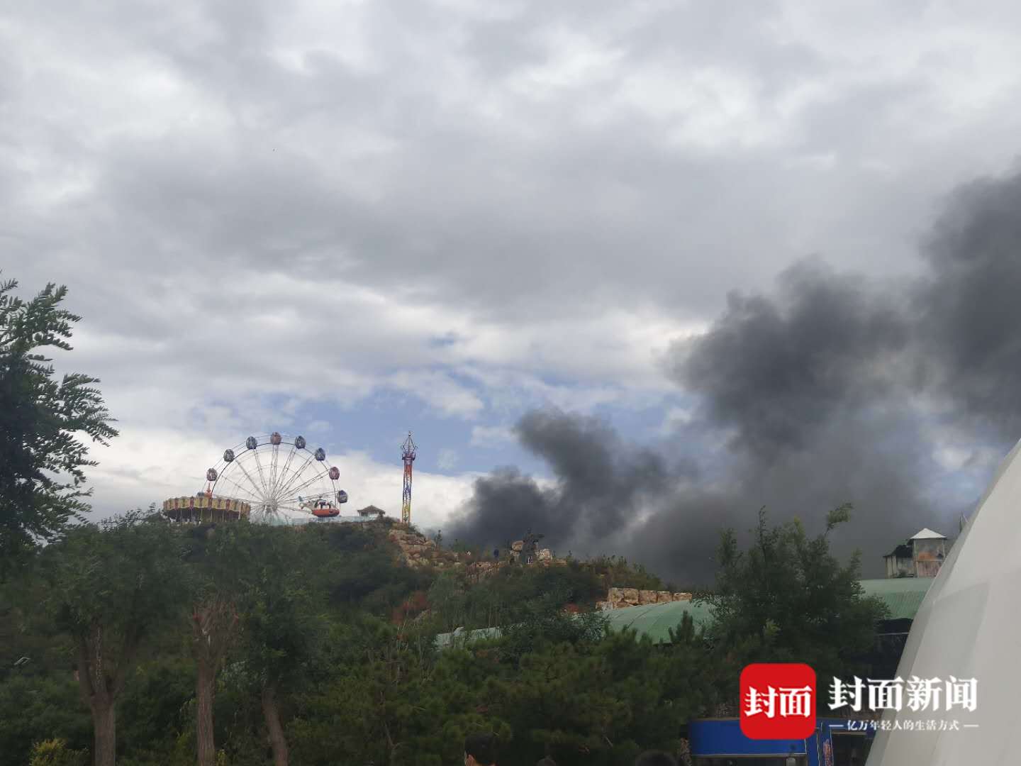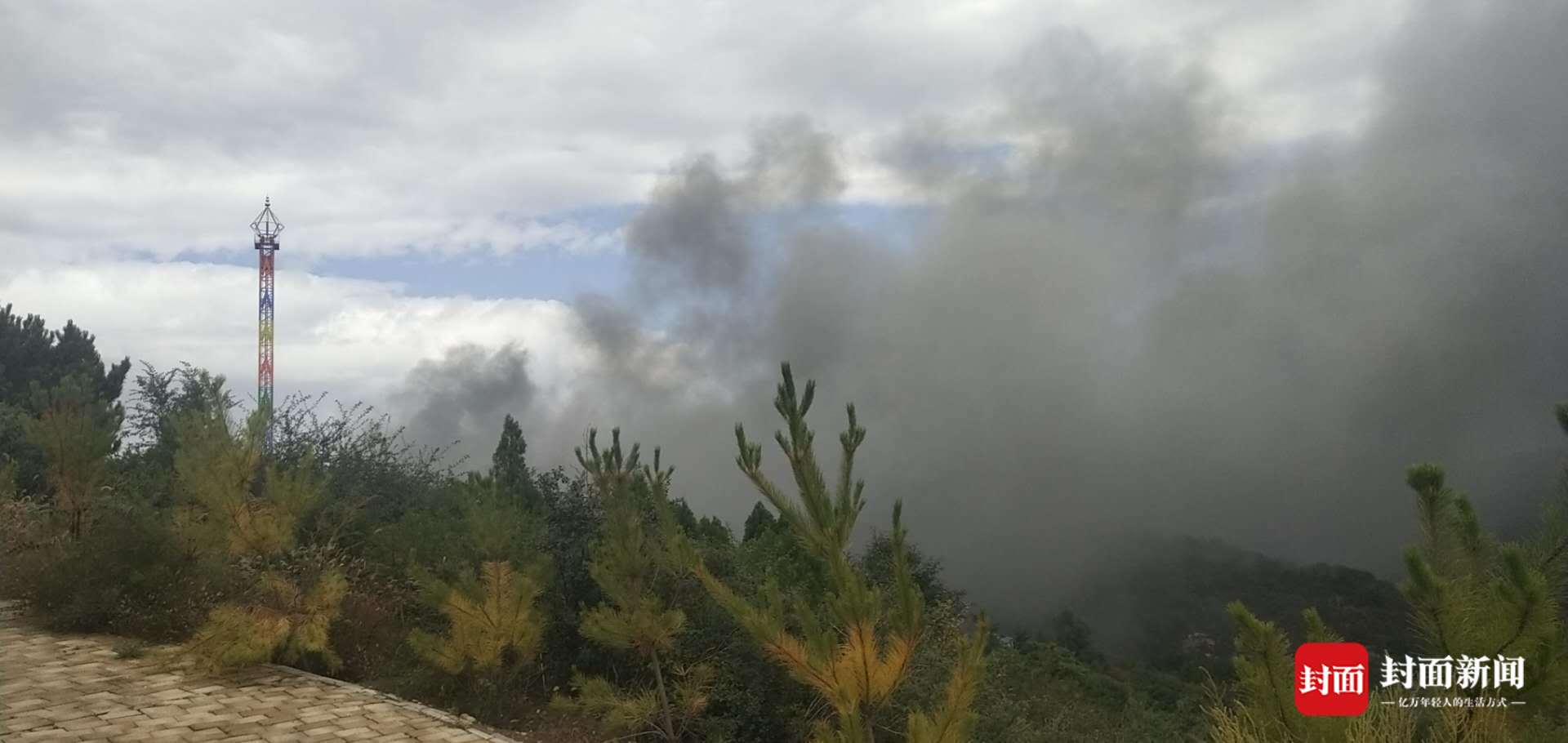 据王先生介绍,事发前,他们一行正在景区内吃饭,位置距离起火点不到20米。吃完饭后,走出来没多久,就看到不远处的建筑有阵阵烟雾升起。