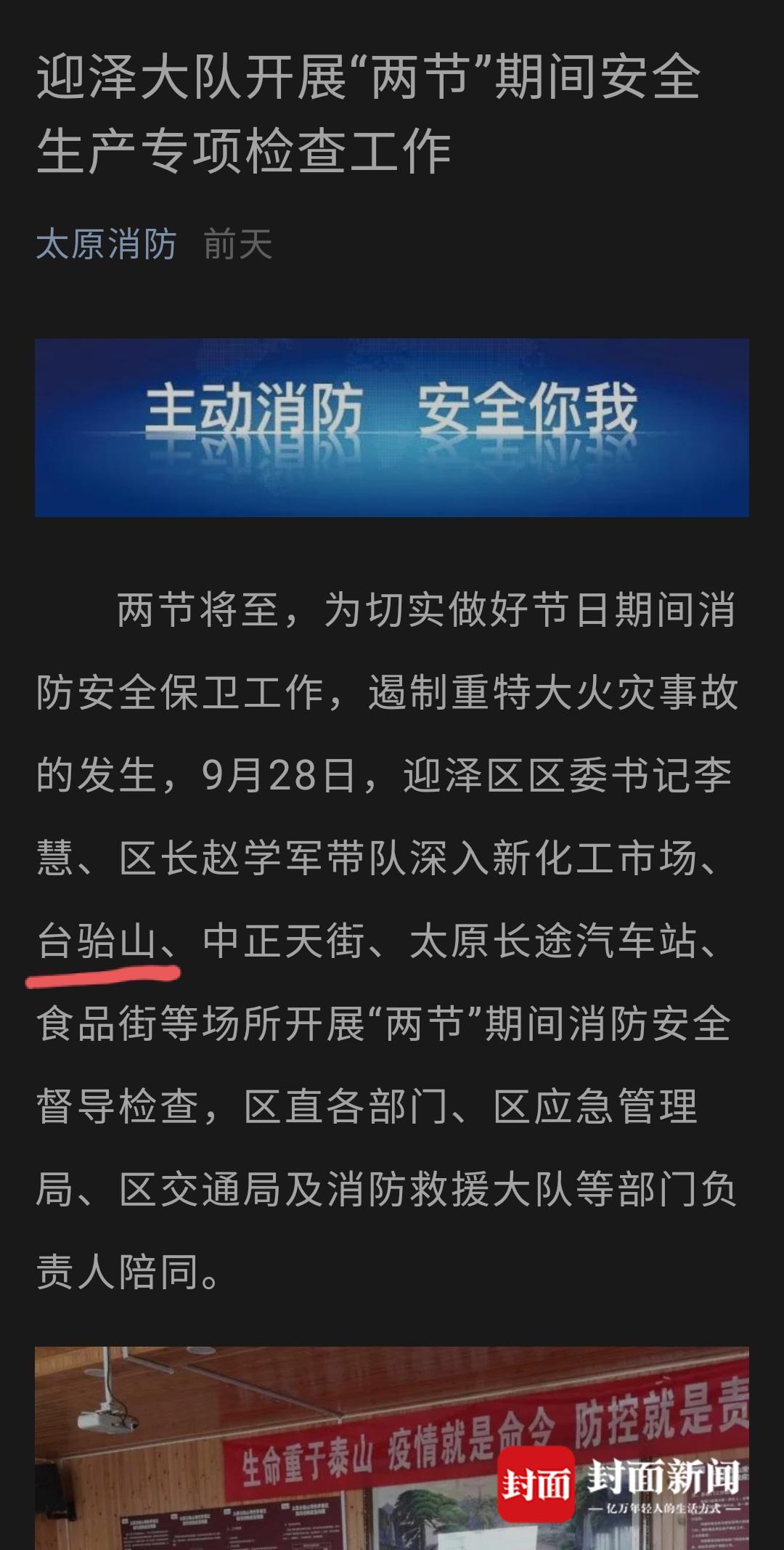 太原消防官方微信公众号,在9月30日发布的一篇消息显示,在事发前的9月28日,太原市迎泽区主要领导,曾带队对台骀山进行了消防安全督导检查。
