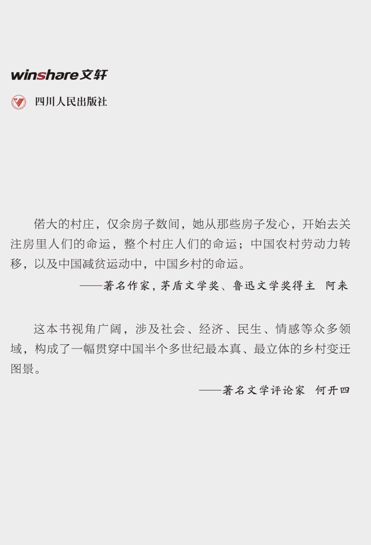 四川省作协主席、著名作家阿来在该书封面上的推荐语中这样精辟总结席秦岭这部作品,“偌大的村庄,仅余房子数间,她从那些房子发心,开始去关注房里人们的命运,整个村庄人们的命运;中国农村劳动力转移,以及中国减贫运动中,中国乡村的命运。”著名文学评论家何开四则在为《一个村庄的流动中国》作的序文中开篇就提到,“仿佛打开了中国近半个世纪来轰轰烈烈的城镇化历史。”