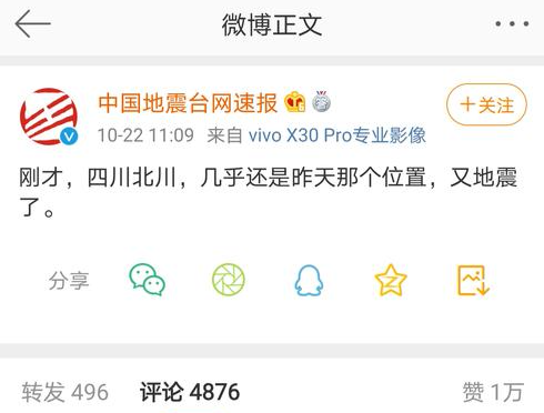 据悉,经中国地震台网正式测定,10月21日12时04分在四川绵阳市北川县(北纬31.84度,东经104.17度)发生4.6级地震,震源深度17千米。
