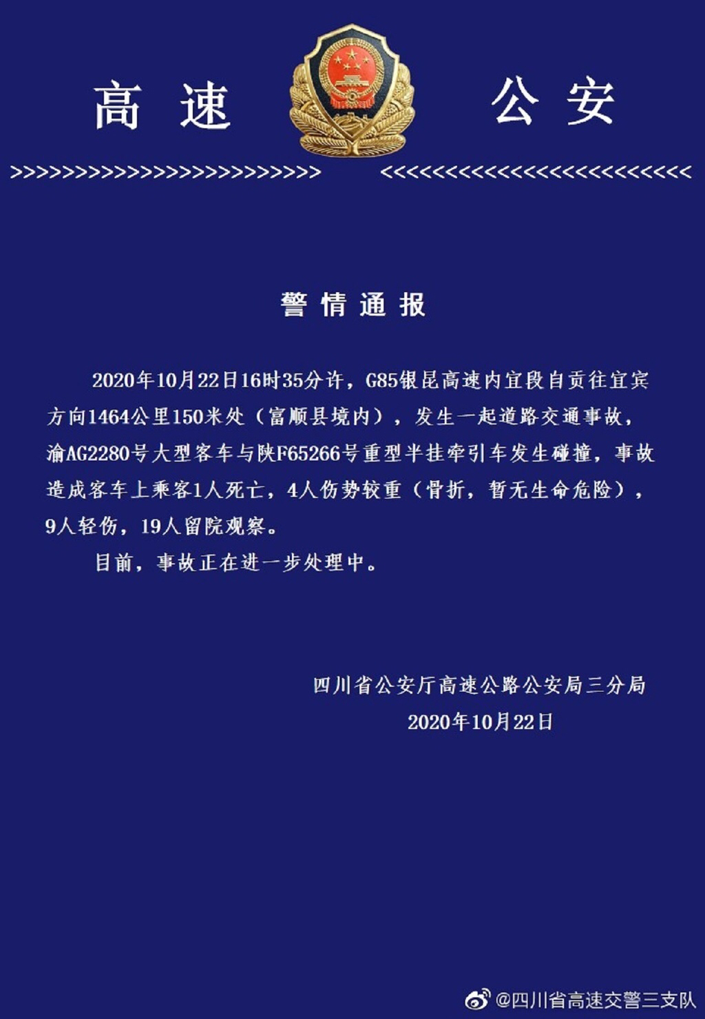 10月22日晚,四川省公安厅高速公路公安局三分局发布警情通报:10月22日16时35分许,G85银昆高速内宜段自贡往宜宾方向1464公里150米处(富顺县境内),发生一起道路交通事故,渝AG2280号大型客车与陕F65266号重型半挂牵引车发生碰撞,事故造成客车上乘客1人死亡,4人伤势较重(骨折,暂无生命危险),9人轻伤,19人留院观察。目前,事故正在进一步处理中。